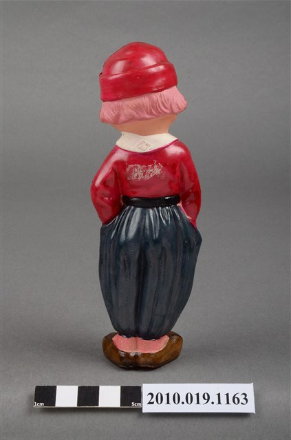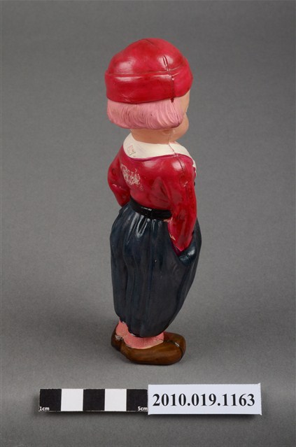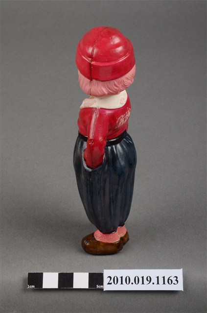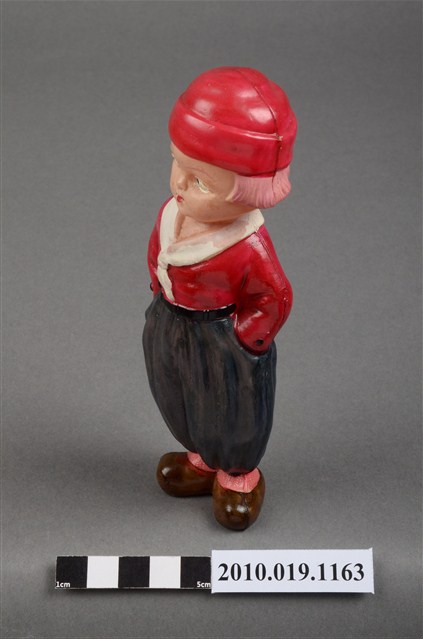 本物件為粉色頭髮女孩玩偶,女孩為粉色短髮斜眼看向左方,雙手插於口袋呈站姿,其身著紅色長袖上衣與黑色長褲且繫白色領巾,頭戴紅色反摺小圓帽,腳穿桃色長襪與棕色鞋履。