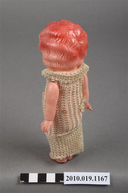 本物件為針織長洋裝女孩玩偶,為橘粉色波浪短髮,黑色眼睛與眉毛,嘴巴塗有口紅,雙手微開呈站姿,其身著米色細編織之長洋裝,底部貼有「MADE IN JAPAN」、「TCTMA INSPECTION PASSED」等字樣等資訊,並印有「MADE IN JAPAN」商標圖樣。
