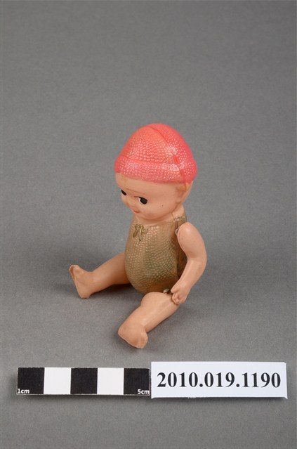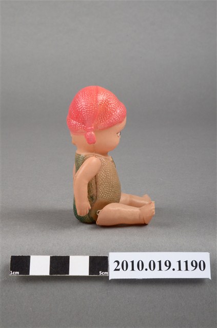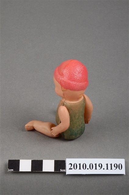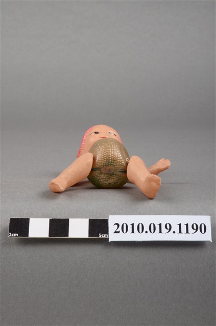 本物件為紅色帽子造型玩偶,為嬰孩造型,呈現坐姿,頭上戴著紅色帽子,身著綠衣。頭部後側寫有「JAPAN」字樣,推測是日本製造。