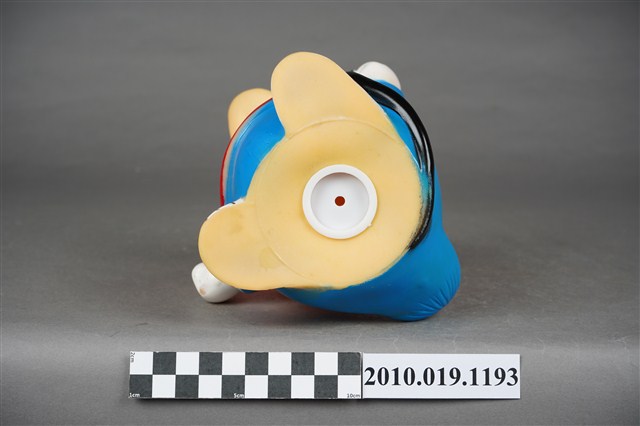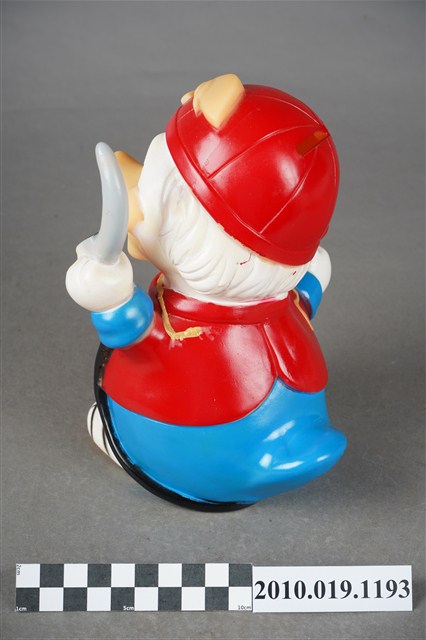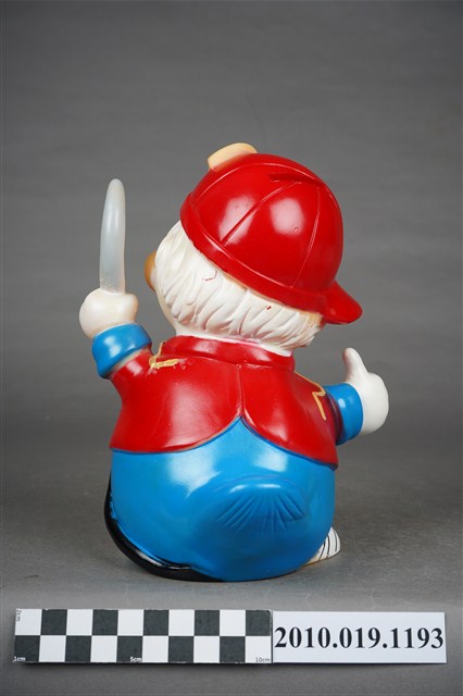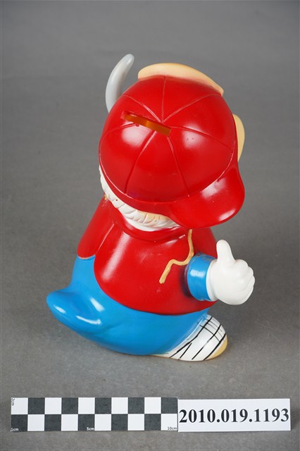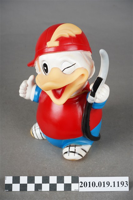 本物件為加油站鴨玩偶存錢筒,材質為塑膠。以擬人姿態站立身穿紅衣藍褲,臉部有一眼呈閉眼狀態,頭戴反向紅色鴨舌帽,上方有一長方形孔洞可投零錢,一手持加油槍,另一手豎立大拇指。底部中心有一白色圓形塞子,應為取出零錢處。
