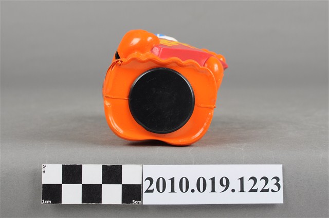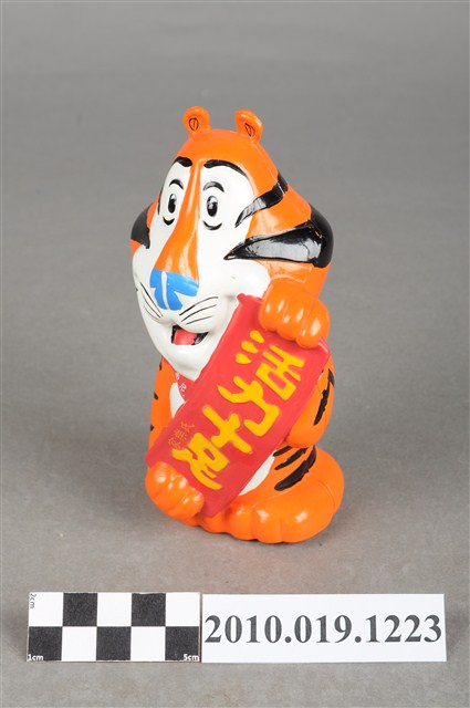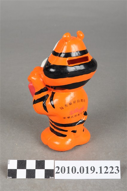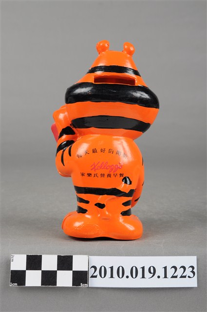 1.本物件為家樂氏東尼虎造型存錢筒,手持「家樂氏 活力十足」字樣紅色卷軸,脖子繫的圍巾有「東尼」字樣。背後則有「每天最好的開始 家樂氏營養早餐」字樣以及「家樂氏」英文商標。