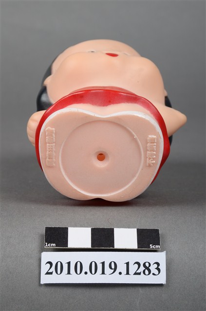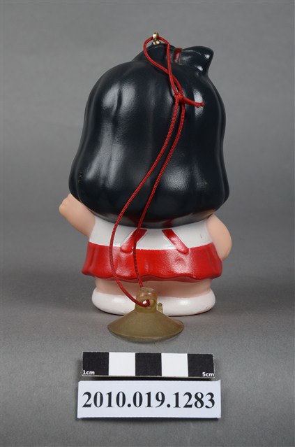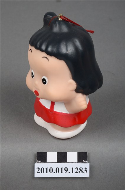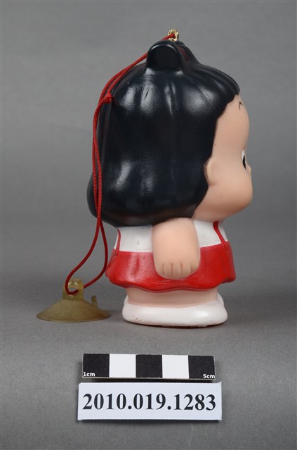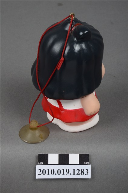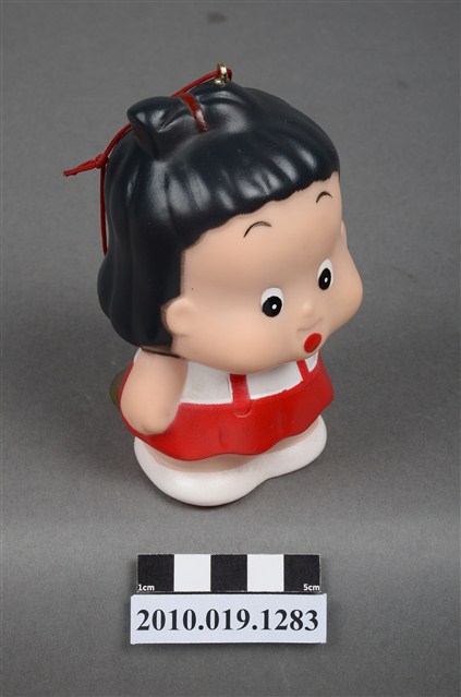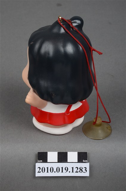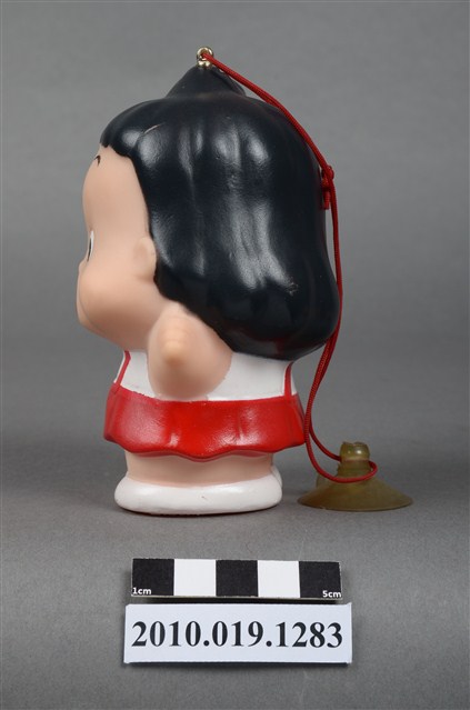 1.本物件為阿華田女孩玩偶,塑膠材質。身穿白衣搭配紅色吊帶褲,呈現開懷大笑的樣貌。頭上有一鐵環,附有紅線與吸盤。底部有一圓孔及「阿華田敬贈」、「不得轉售」字樣。