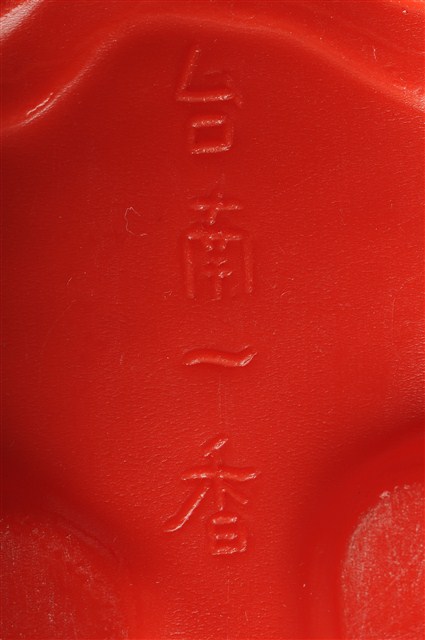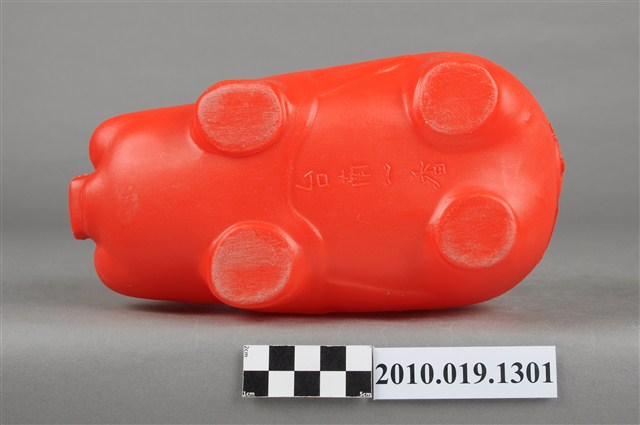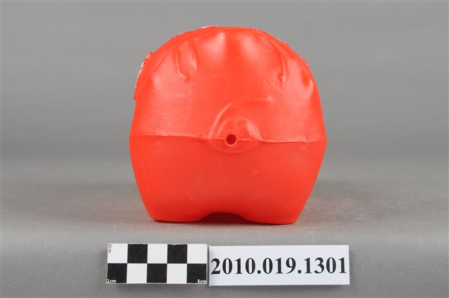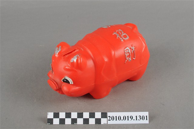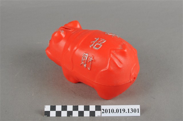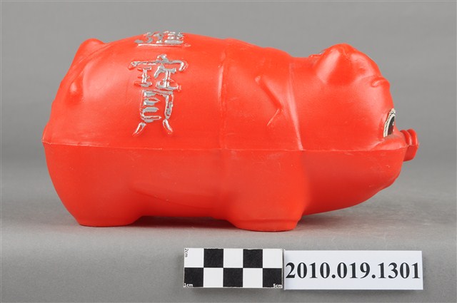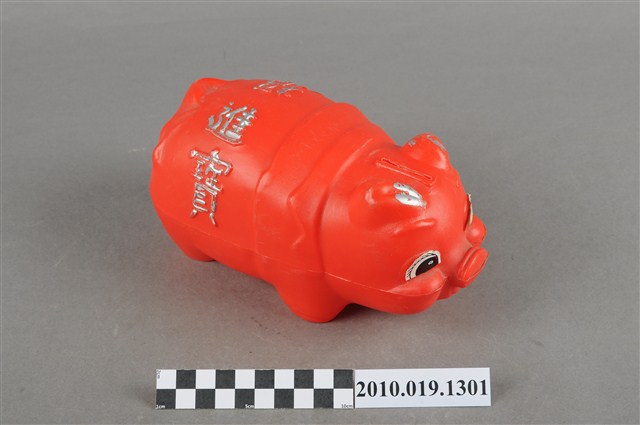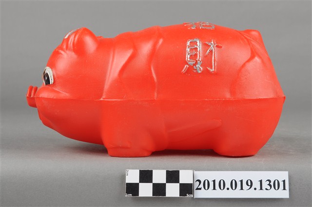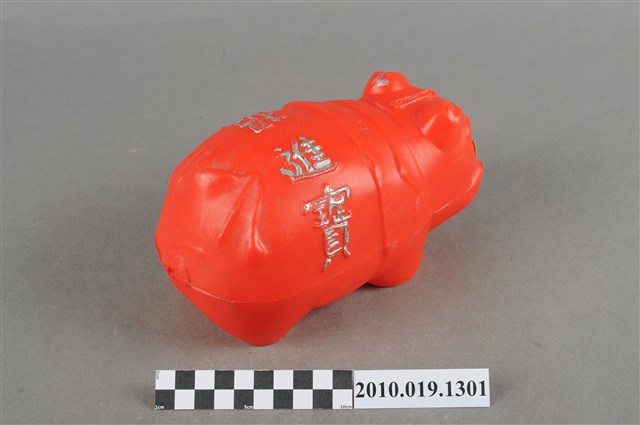 本物件為招財進寶紅豬公存錢筒,材質為塑膠。豬眼睛以貼紙貼上,頭部上方有一長方形孔洞可投零錢,耳朵的銀漆有部分脫落,身體印有銀色「招財進寶」字樣,底部有「臺南一香」字樣。