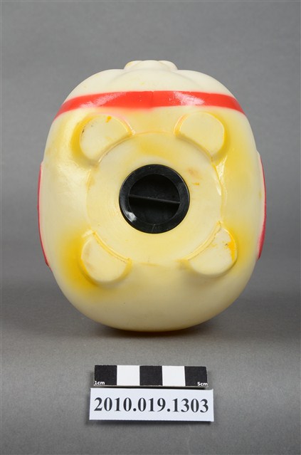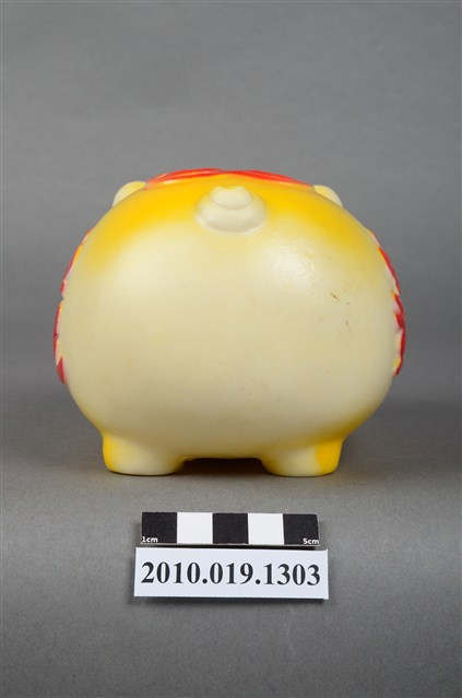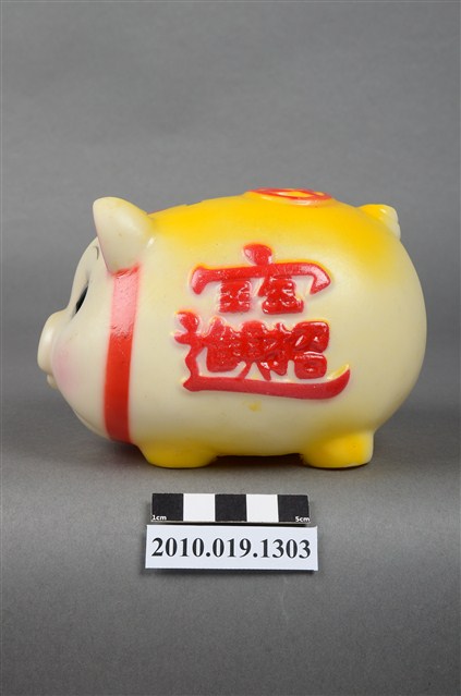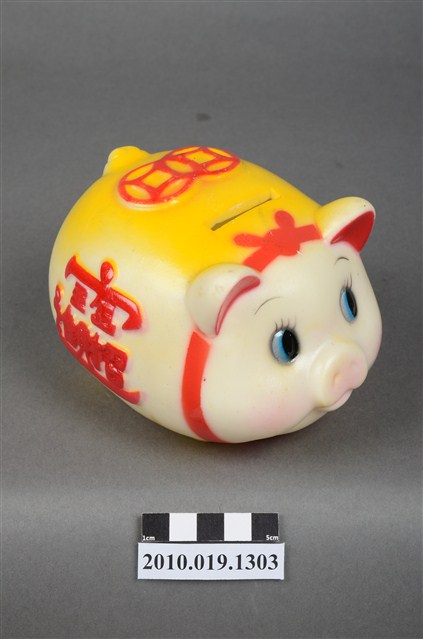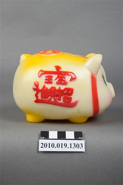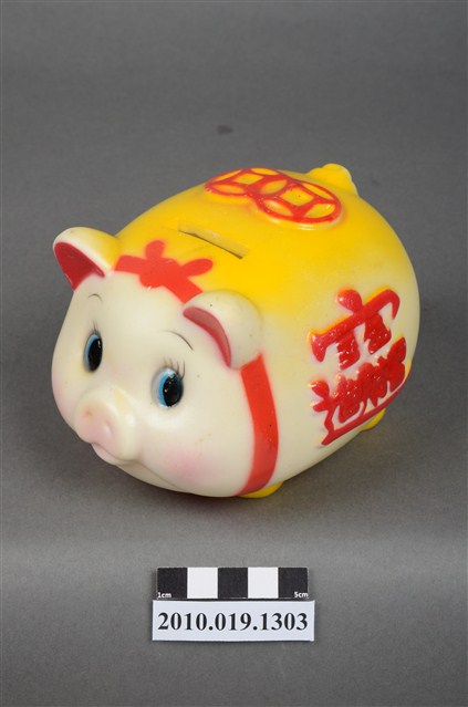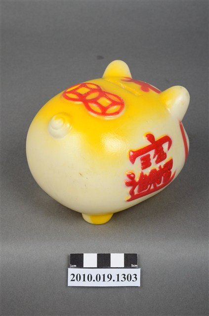 1.本物件為彩繪豬造型存錢筒。塑膠製,眼睛為藍黑色,耳朵為紅色,頭部有蝴蝶結,兩側有「招財進寶」合文字樣,頂部有兩個古代銅錢圖樣,背部及腳部為黃色。