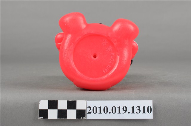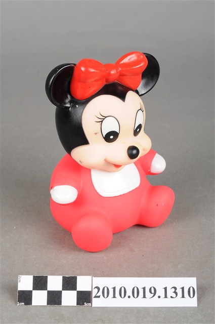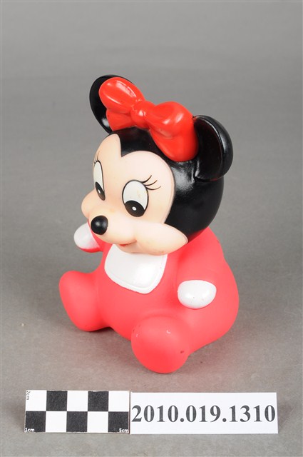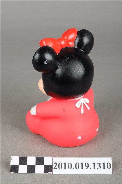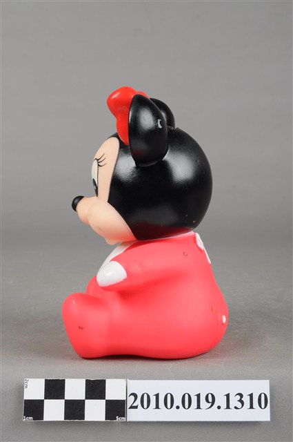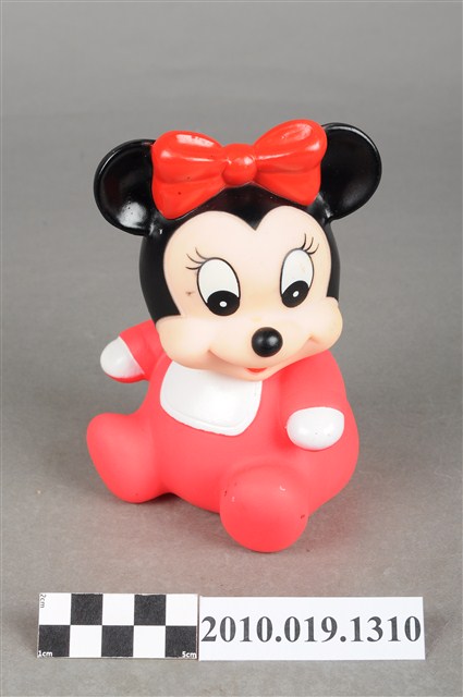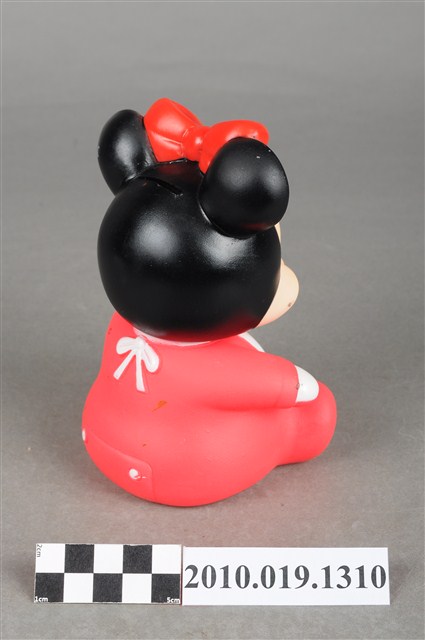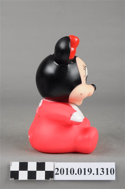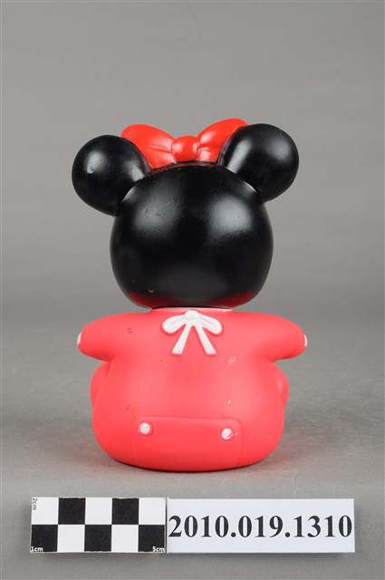 1.本物件為米妮嬰兒造型存錢筒。頭戴紅色蝴蝶結,身穿紅色嬰兒裝、白色圍兜,手戴白色手套。底部有"FAIR TOYS"及「惠兒」等字樣。