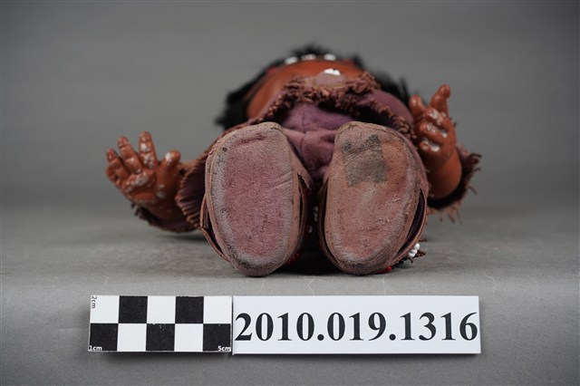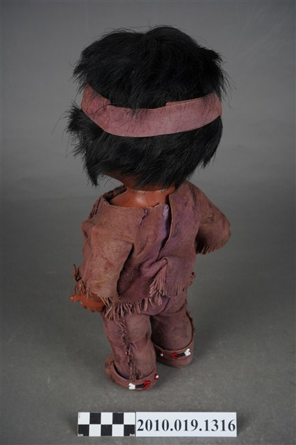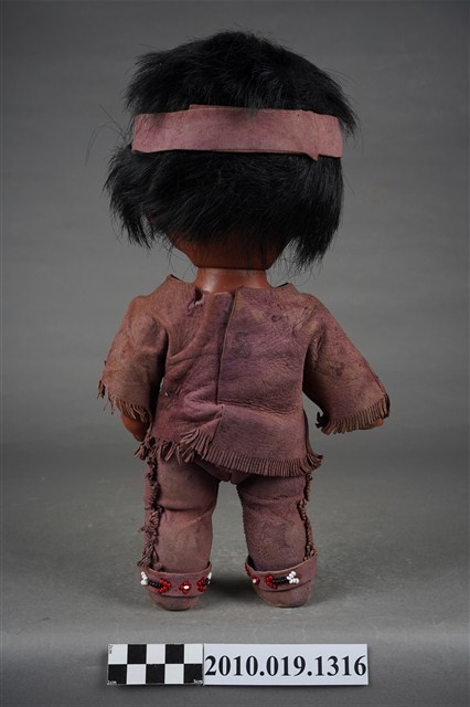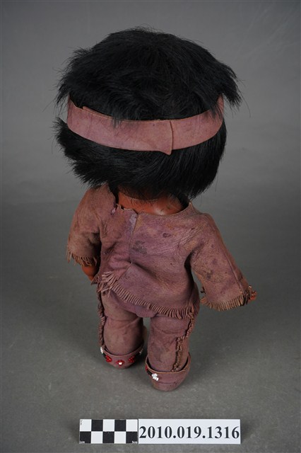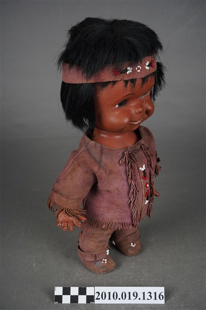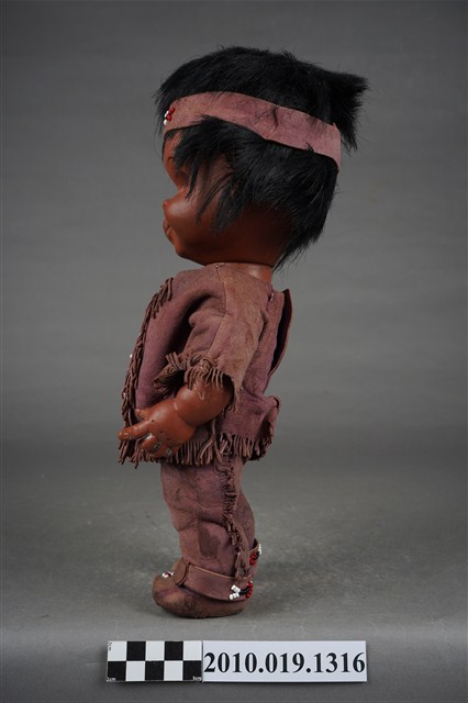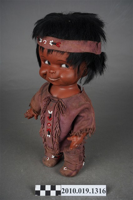本物件為男孩玩偶,塑膠材質,皮膚黝黑。身上的服裝、鞋子與髮帶配件皆為咖啡色,並有串珠裝飾。衣服上有許多髒污。