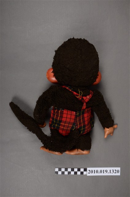 本物件為猴子玩偶,塑膠材質,眼睛為雙眼半睜的姿態,身穿紅色格紋吊帶服。除了臉部、手及腳部位的皮膚外,其餘皆為咖啡色棉質布料覆蓋。部分手指為翹起狀態。