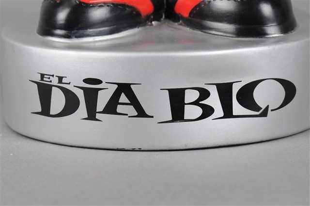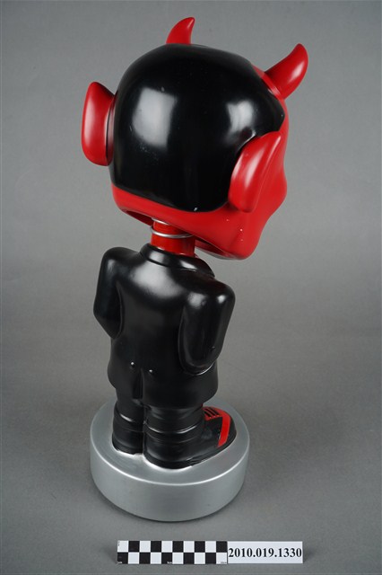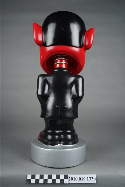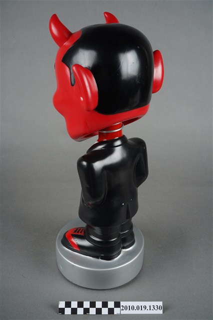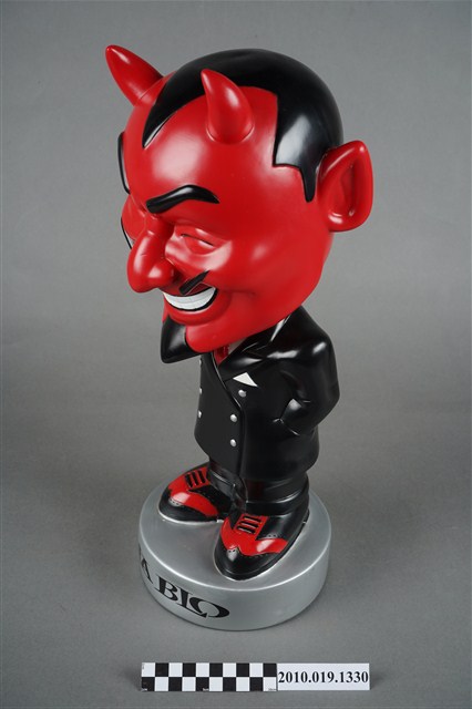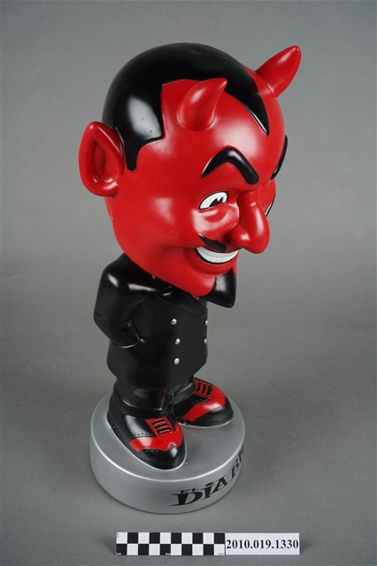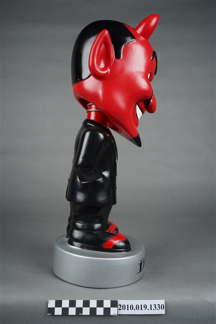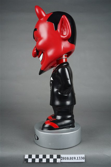 本物件為紅魔鬼玩偶,塑膠材質,頭部為紅色。玩偶身穿黑色全套西裝,做露齒笑與眨眼姿態,皮鞋為紅、黑顏色相間。頭部與身體部位可分離,脖子的連接處為彈簧。玩偶的底座有「EL DiA BLO」字樣,底座底部則有「FUNKO 2003-They Come to ME!!!」、「A FUNKO Inc. Product」、「www.funko.com」與製造產地中國的英文字樣,中間有一圓孔。