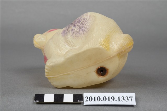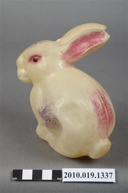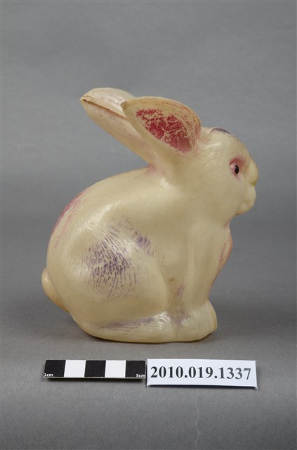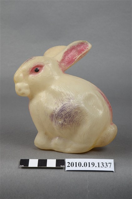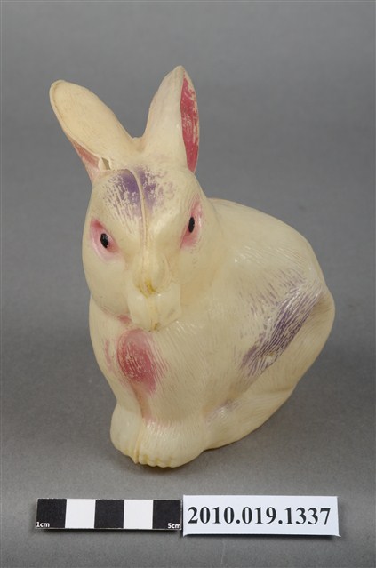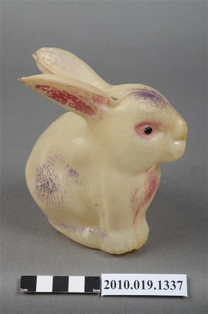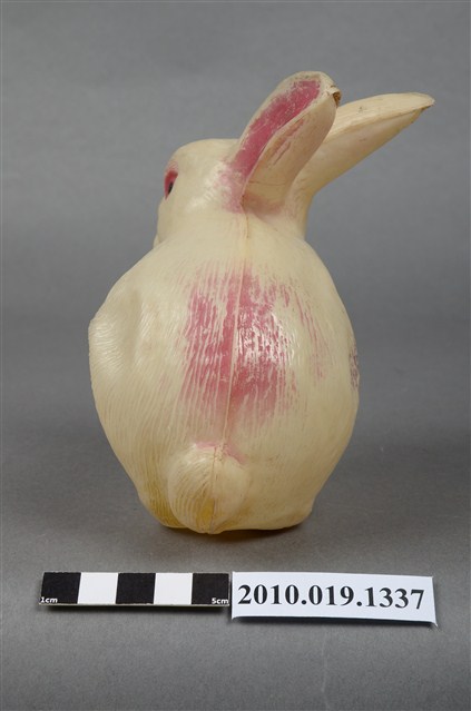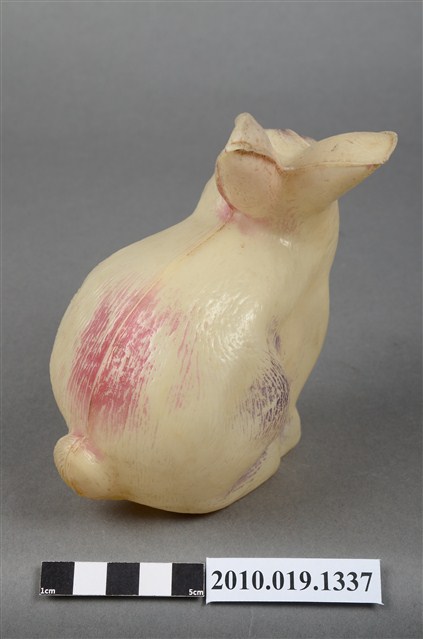 本物件為兔子玩偶,塑膠材質。整體顏色為白色,並有紅色與紫色顏料妝點。玩偶屁股底部有一圓孔,其呈現鏽蝕狀況。