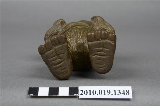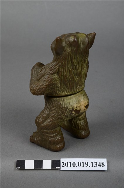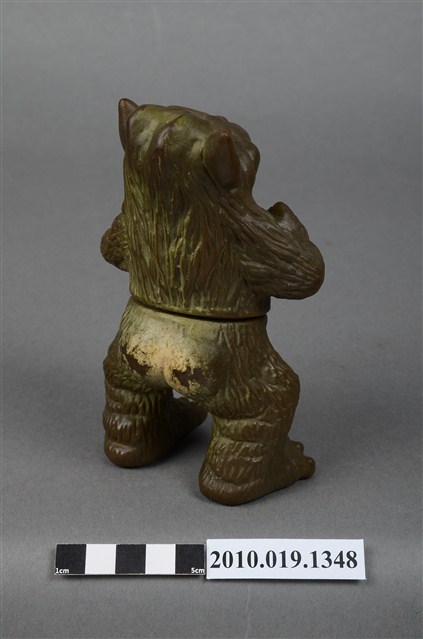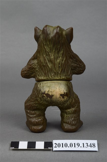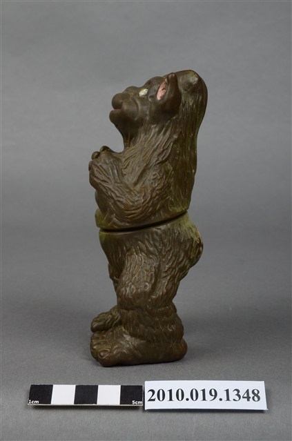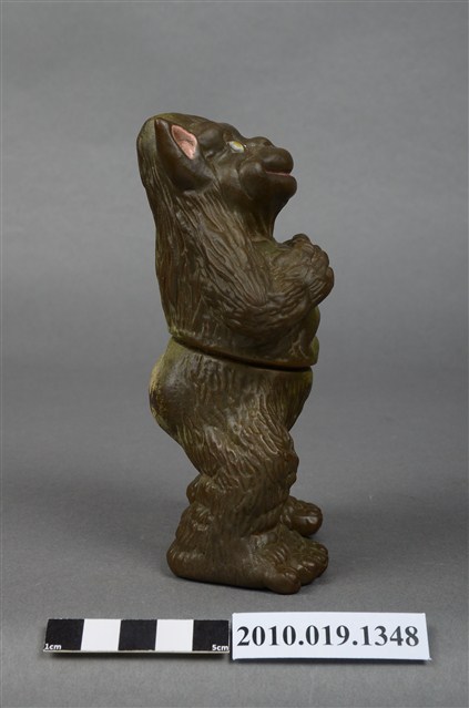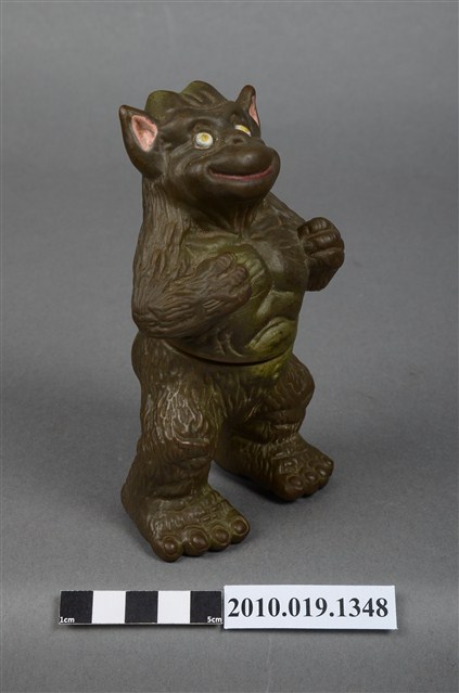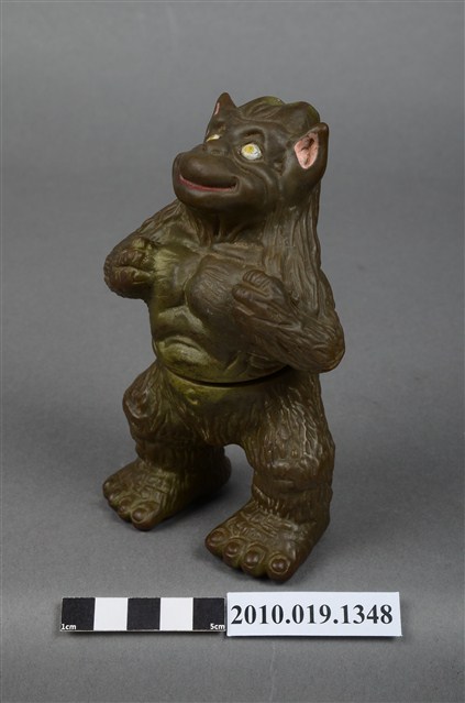本物件為大猩猩玩偶,塑膠材質,站姿,雙手放於胸前。整體顏色為墨綠色,耳朵、眼睛與嘴巴有黃、白、紅與粉紅色顏料塗裝。