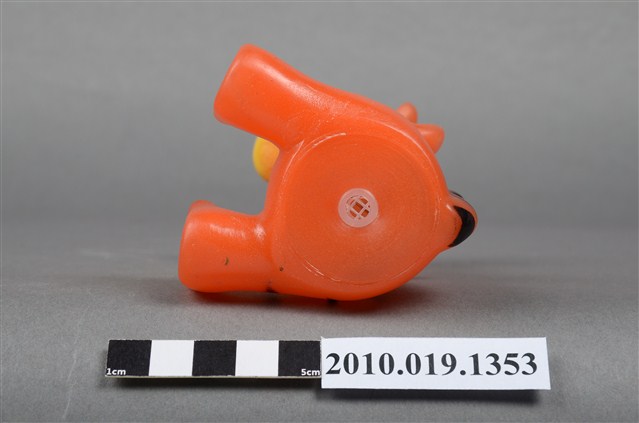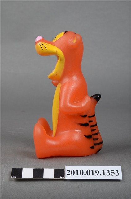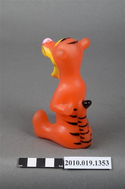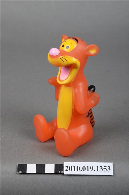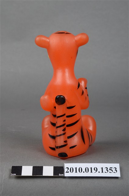 1.本物件為跳跳虎玩偶,塑膠材質,呈坐姿。玩偶主要顏色為橘色與黃色,鼻子與嘴巴為粉紅色,身上的花紋為黑色,玩偶底部有一網狀圓孔。