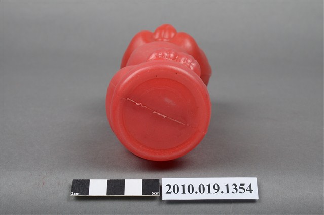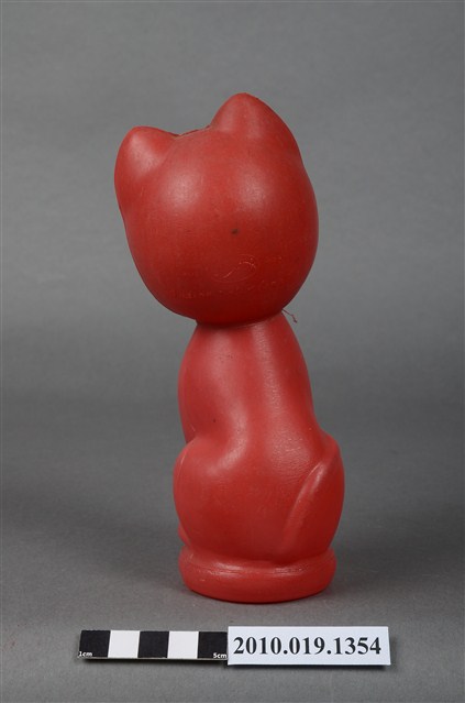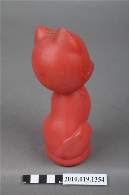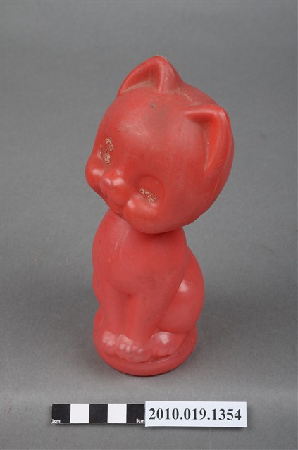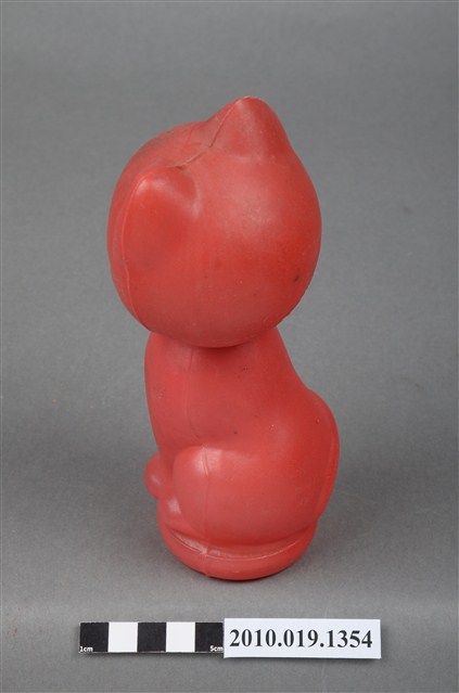 本物件為貓玩偶,塑膠材質,呈坐姿。玩偶顏色為紅色,玩偶底部有一明顯接縫處。本物件表面上有許多髒污。
