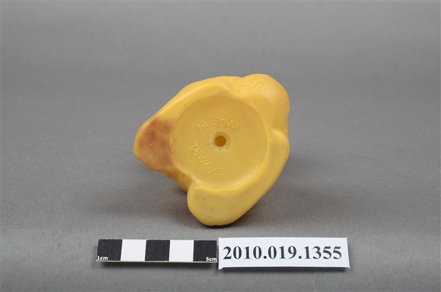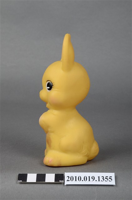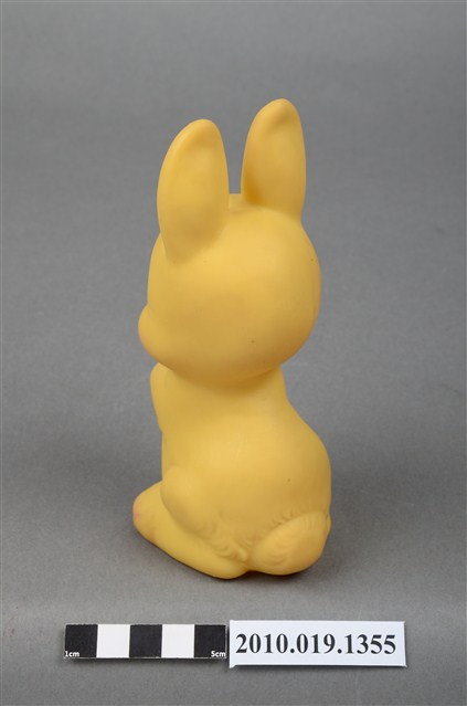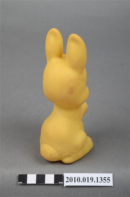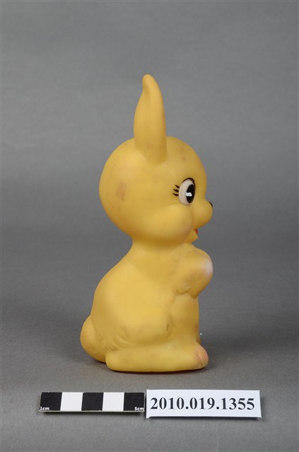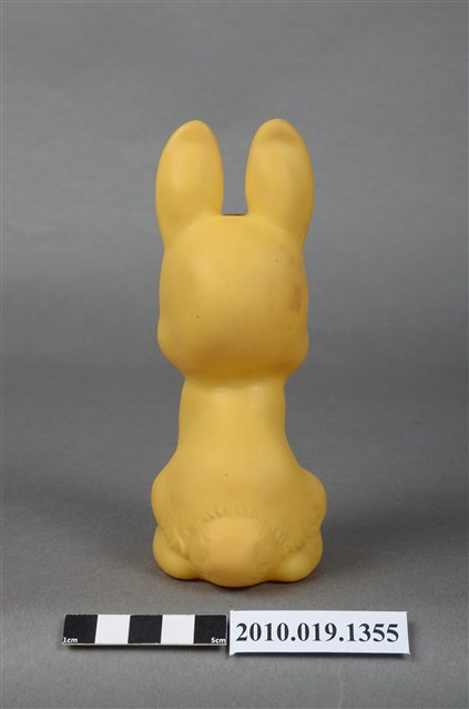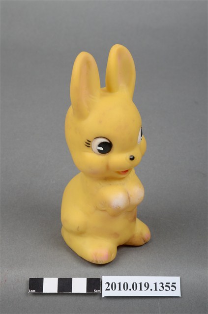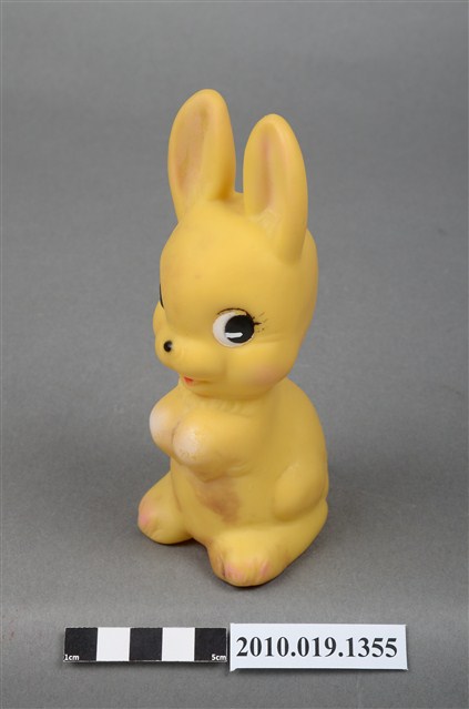 本物件為兔子玩偶,塑膠材質,呈坐姿。玩偶顏色為黃色,眼睛有黑、白色顏料塗裝,鼻子為黑色,嘴巴為紅色。玩偶底部有一圓孔,周圍有MADE IN TAIWAN、3字樣。本物件表面上有許多髒污。