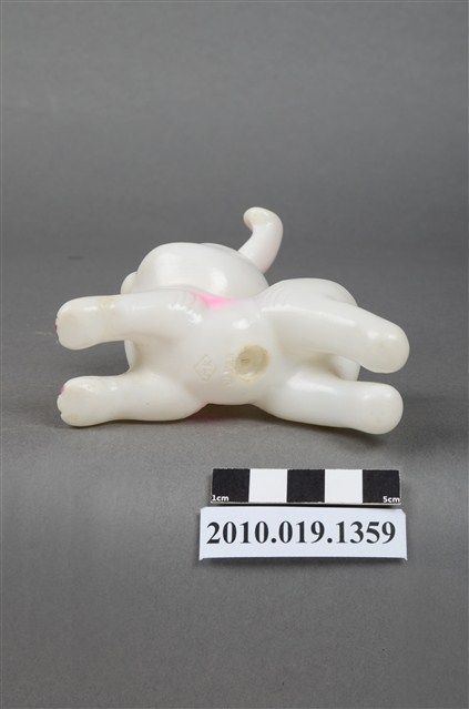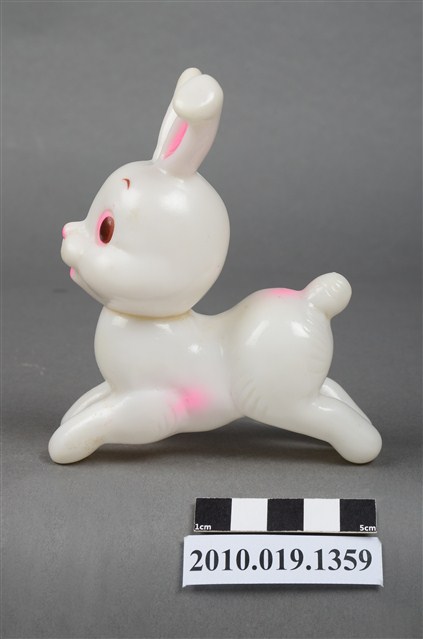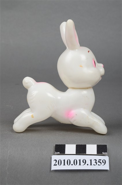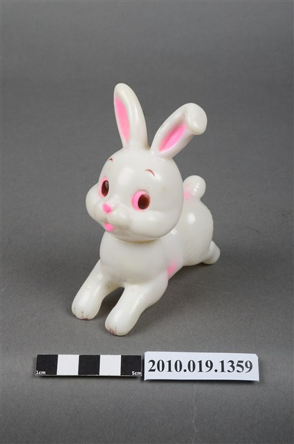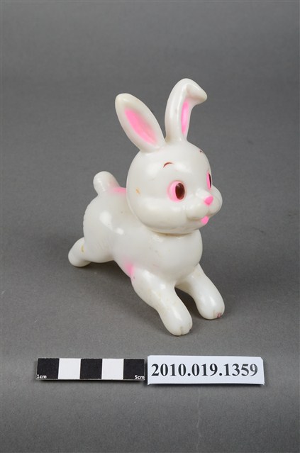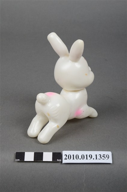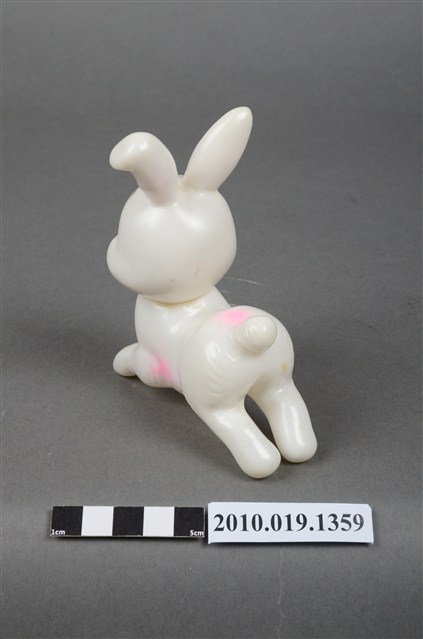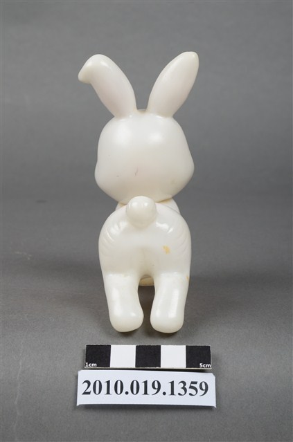 本物件為兔子玩偶,塑膠材質。玩偶顏色為白色,眼睛有黑、粉紅色顏料塗裝,耳朵、鼻子與嘴巴為粉紅色。玩偶底部有一圓孔,周圍有英文字樣。本物件表面上有許多髒污。