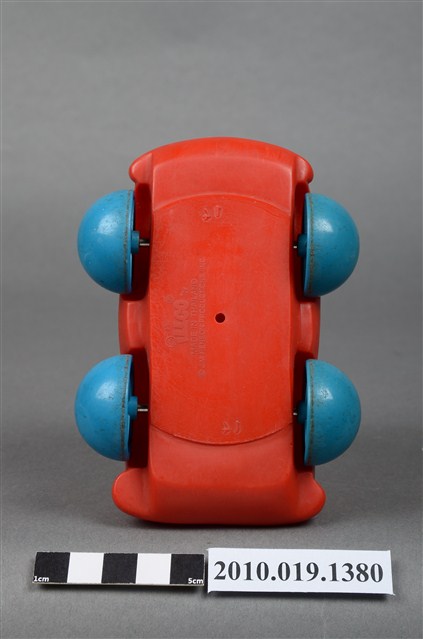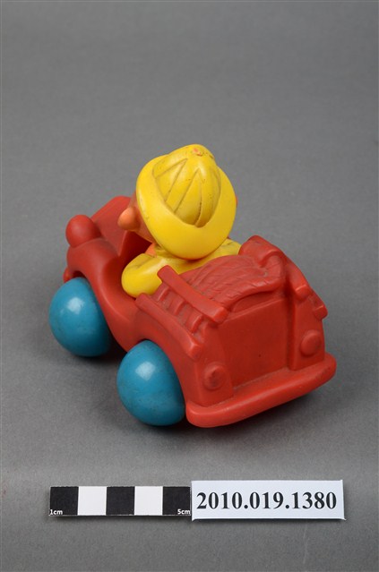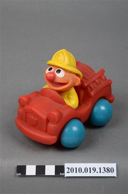 1.本物件為芝麻街恩尼與汽車玩具,塑膠材質。恩尼玩偶身體為橘色,頭戴黃色帽子,駕駛著紅色小汽車,汽車輪子為藍色。汽車底部有MADE IN THAILAND、JIM HENSON PRODUCTIONS INC.字樣。