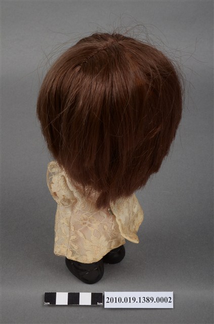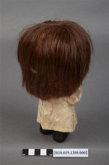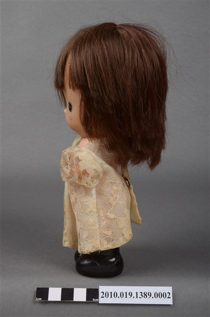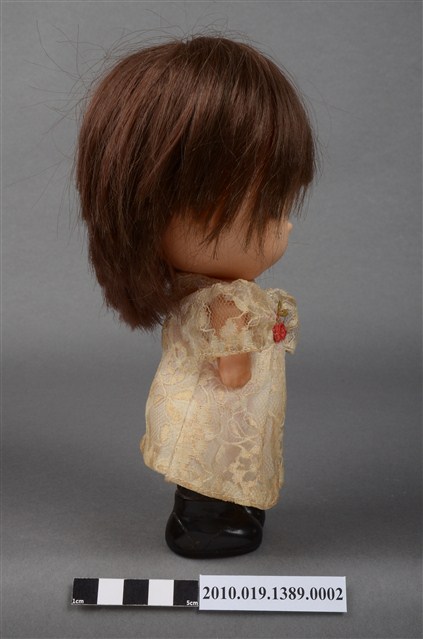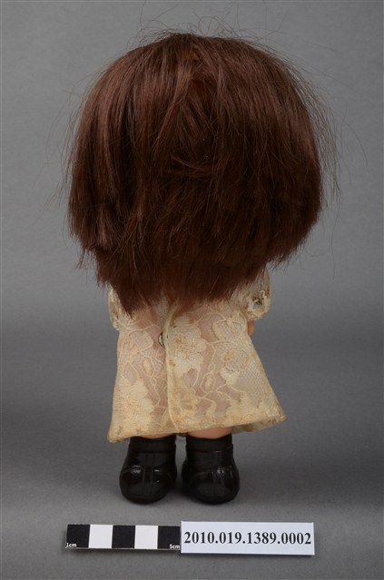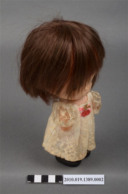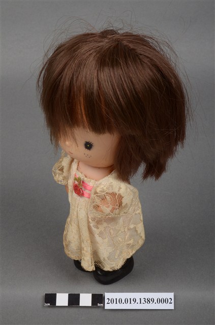 本物件為新娘玩偶,塑膠材質。玩偶有著咖啡色長髮、長睫毛與雀斑,穿著蕾絲連身洋裝搭配黑色皮鞋,衣服上有粉紅色花朵裝飾。本物件表面上有許多髒污。