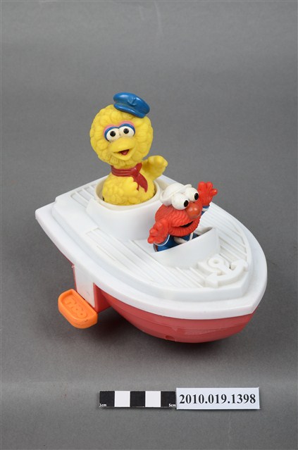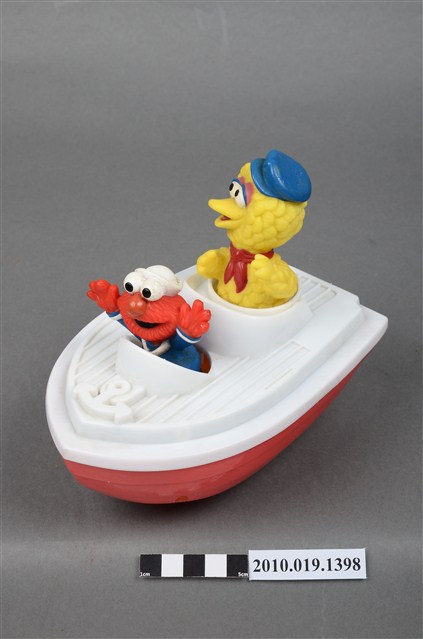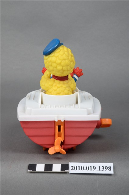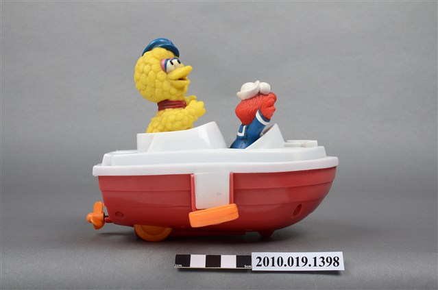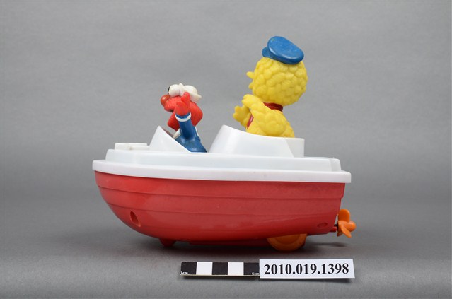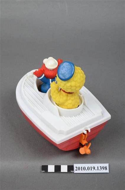 1.本物件為芝麻街大鳥、艾蒙與船玩具,塑膠材質。大鳥玩偶身體為黃色,頭戴藍色帽子,坐在船的後座;艾蒙玩偶身體為紅色,身穿藍色水手服,坐在船的前座,作高舉雙手狀。船身上半部為白色,下半部為紅色,船的一側有橘色發條,上有TYDO字樣,船底部有3個齒輪,以及TYDO PLAYTIME INC.、MADE IN CHINA、1995、Jim Henson Productions Inc.字樣。
