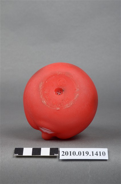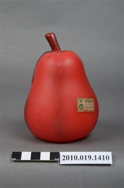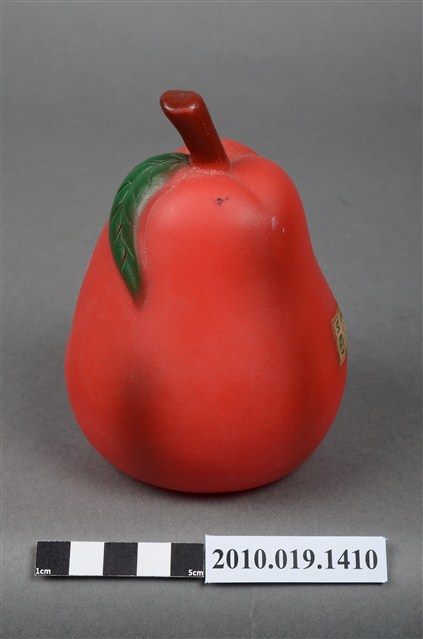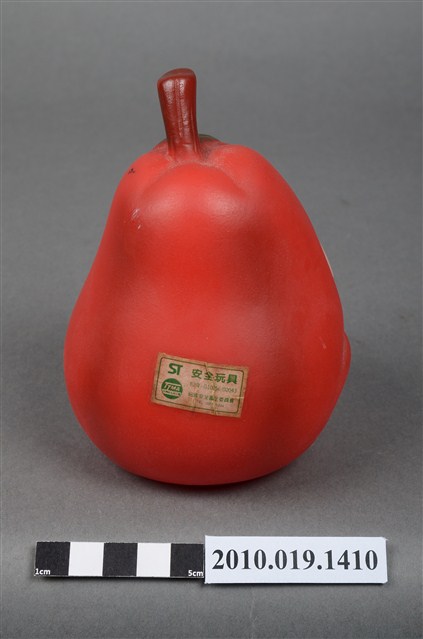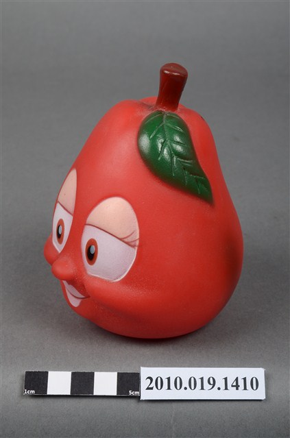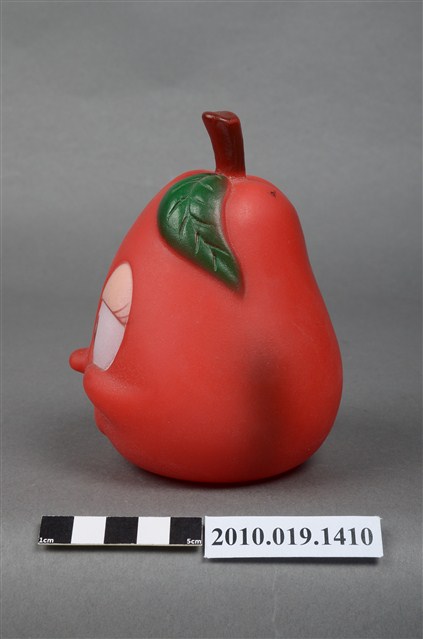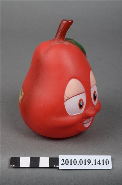 本物件為美國西洋梨玩偶,塑膠材質。玩偶為西洋梨造型,性別為女性,顏色為紅色,具有眼睛、鼻子與嘴巴等器官。頭頂上有咖啡色果柄,底部有一圓形網狀孔洞,周邊有美國西洋梨字樣及應為美國西洋梨之商標。背後貼有一安全玩具標籤紙,有82年、G10256-02043、玩具安全鑑定委員會等字樣。本物件表面上有許多髒污。