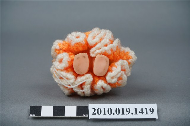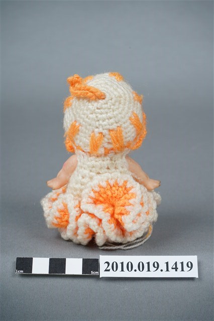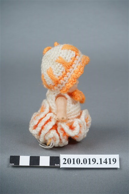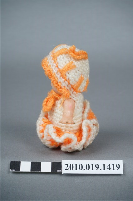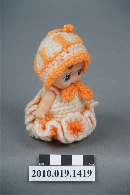 1.本物件為丘比娃娃,塑膠材質。玩偶臉部有著長睫毛,眼睛有白、黑與藍色顏料塗裝,頭戴橘色與白色毛線織成的帽子,圍著橘色領巾,穿著白色洋裝,下擺為橘色與白色相間。本物件表面上有許多髒污。2.丘比娃娃在1909年由美國插畫家Rose O'Neill,參考愛神Cupid所畫的娃娃,1912年由德國廠商加以實體化,為丘比娃娃的雛型,由於受到歡迎,1922年日本美乃滋大廠Kewpie將丘比娃娃訂為該公司的商標。