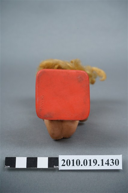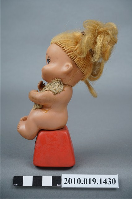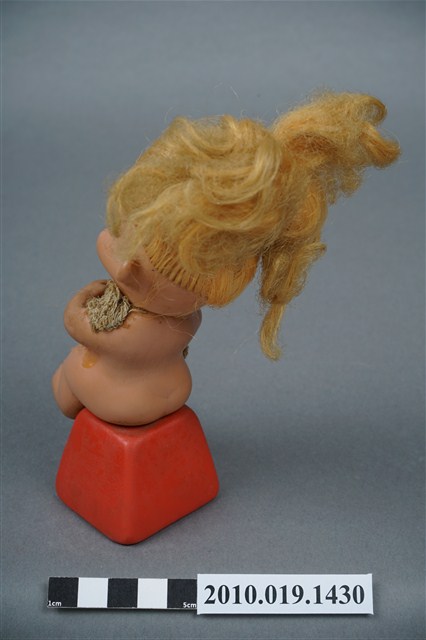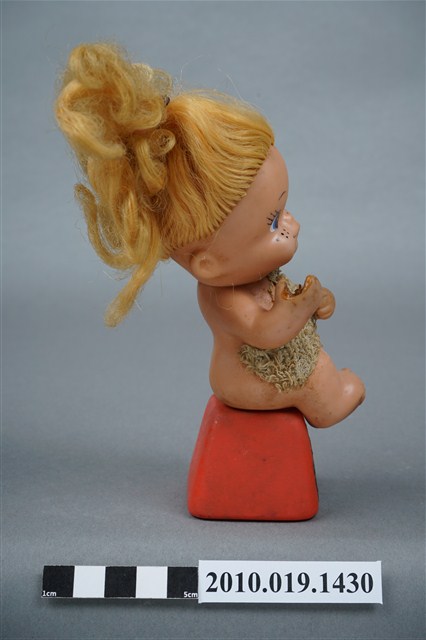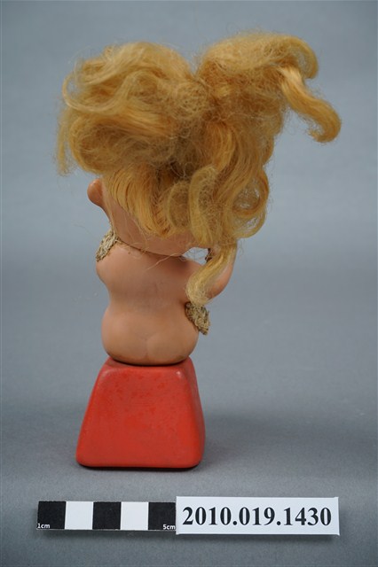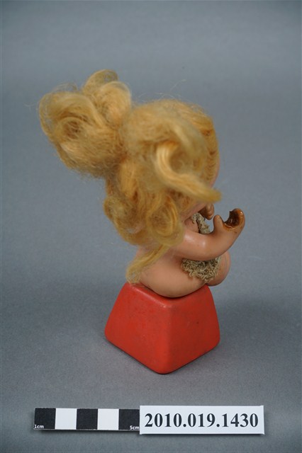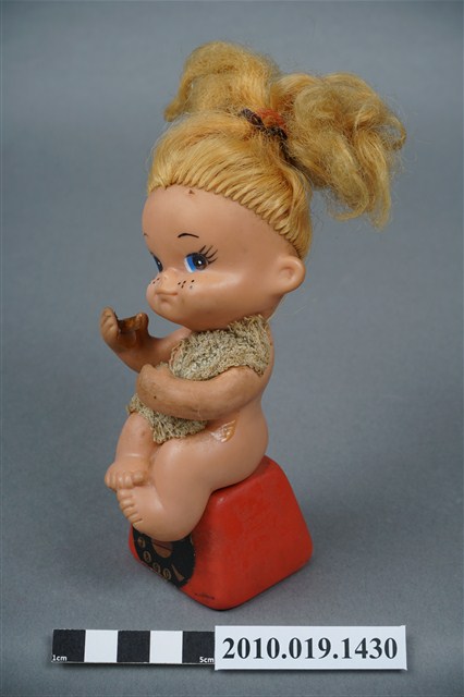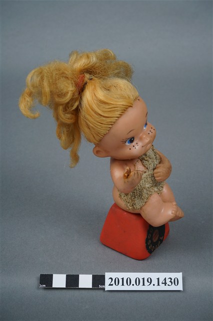 本物件為女孩玩偶,塑膠材質。玩偶臉部有著長睫毛,眼睛有白、黑與藍色顏料塗裝,金黃色頭髮,穿著應為原始人服裝,坐在應為手撥式號碼電話上。玩偶底部有 TAIWAN字樣,本物件表面上有許多髒污。