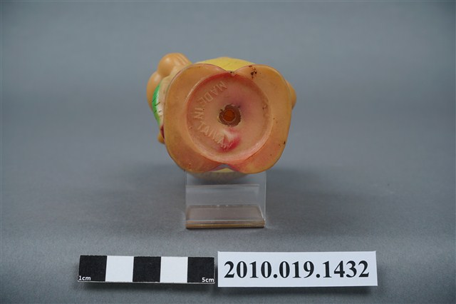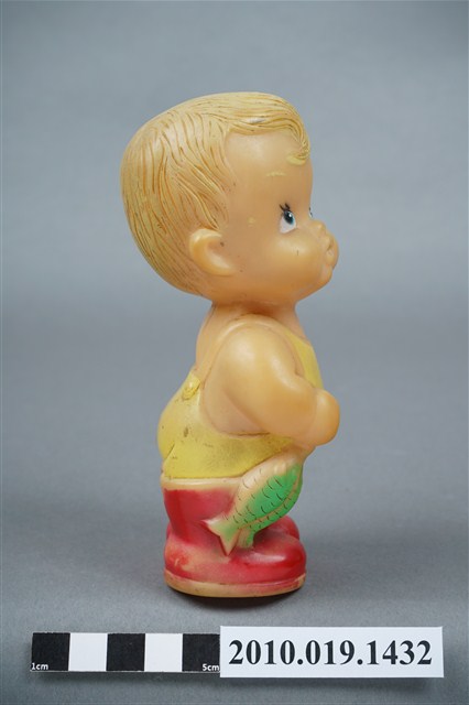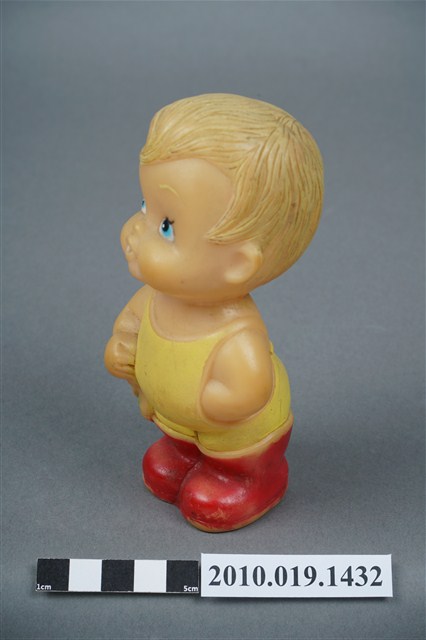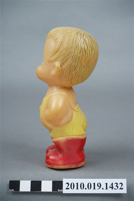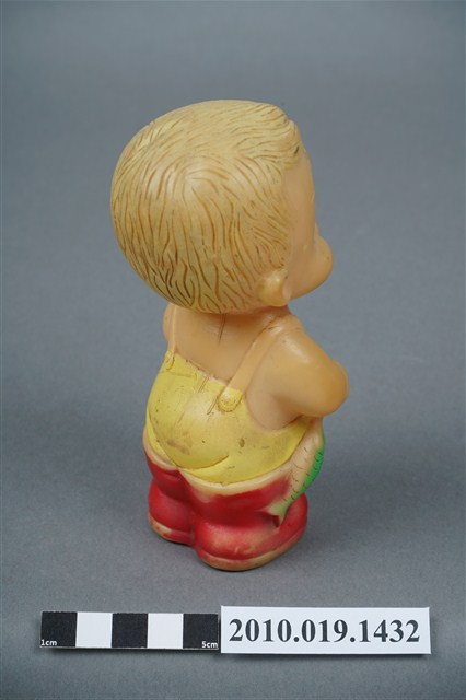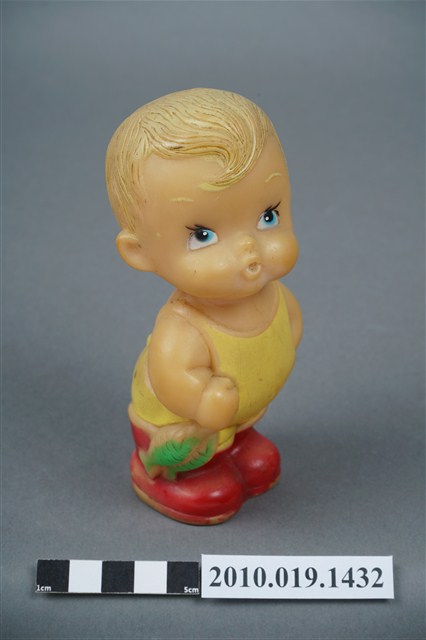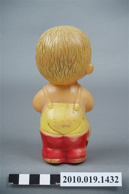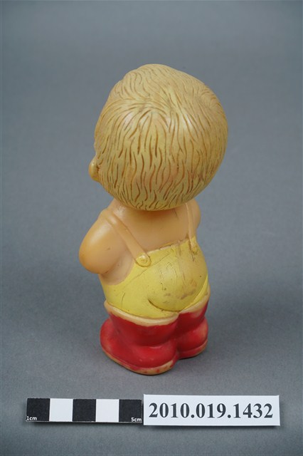 本物件為男孩抓魚玩偶,塑膠材質。玩偶呈嘟嘴貌,一手抓著2條魚,一手插在衣服內。玩偶服裝為黃色吊帶褲,搭配紅色鞋子,底部有MADE IN TAIWAN字樣,本物件表面上有許多髒污。