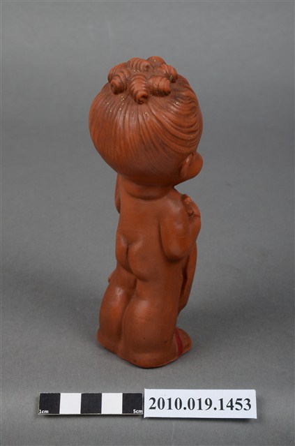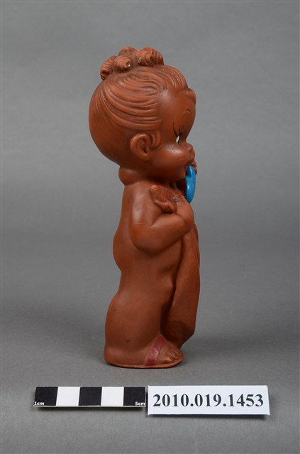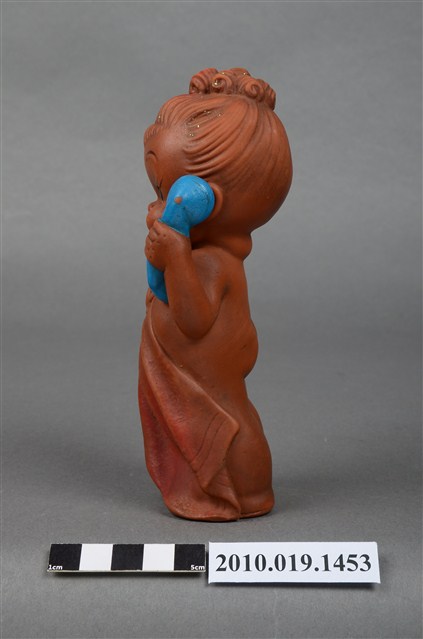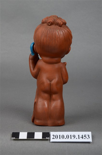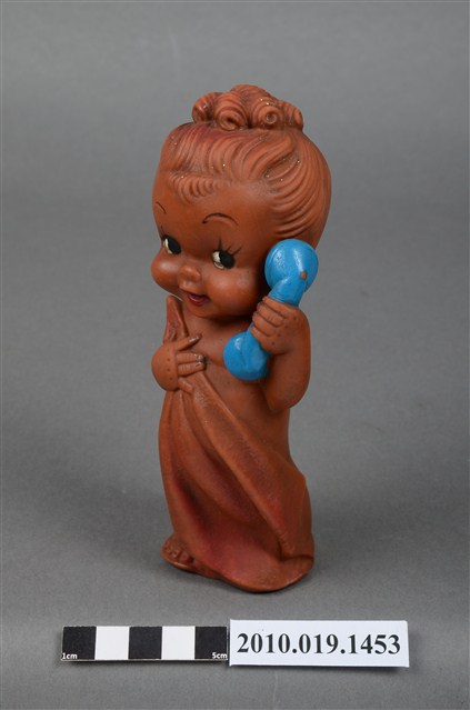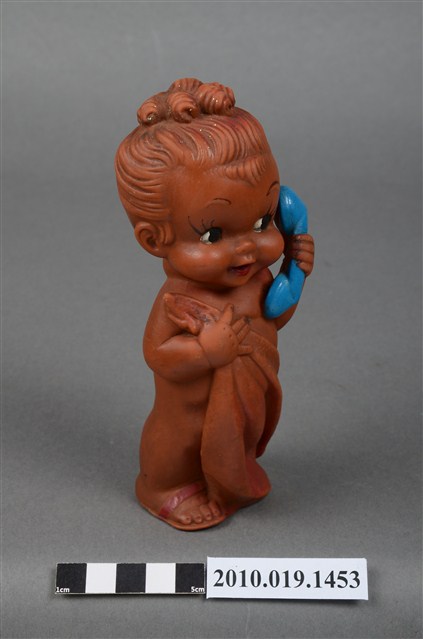 本物件為女孩玩偶,塑膠材質。玩偶顏色為咖啡色,臉部有著長睫毛,眼睛有白與黑色顏料塗裝,左手持一個藍色電話話筒,右手拉著遮蓋身體的毛巾。玩偶底部有一圓形孔洞,本物件表面上有許多髒污。