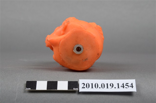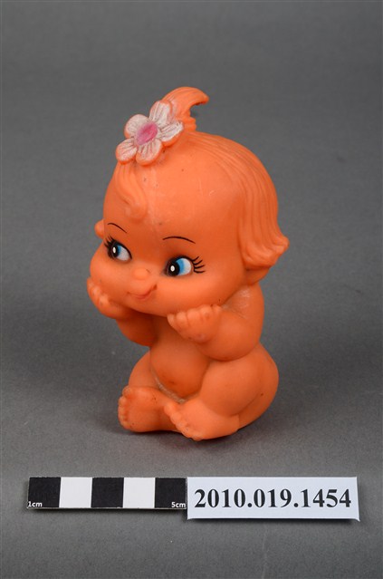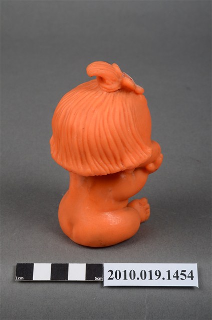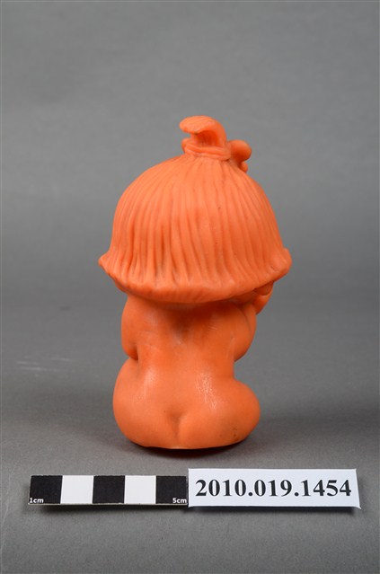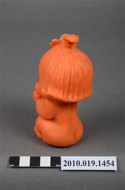 本物件為女孩玩偶,塑膠材質,呈坐姿。玩偶顏色為橘色,臉部有著長睫毛,眼睛有白、黑與藍色顏料塗裝,頭髮上有一花朵裝飾。玩偶的嘴巴往一邊翹起,雙手扶在臉頰下方。玩偶底部有一圓形孔洞,本物件表面上有許多髒污。