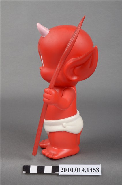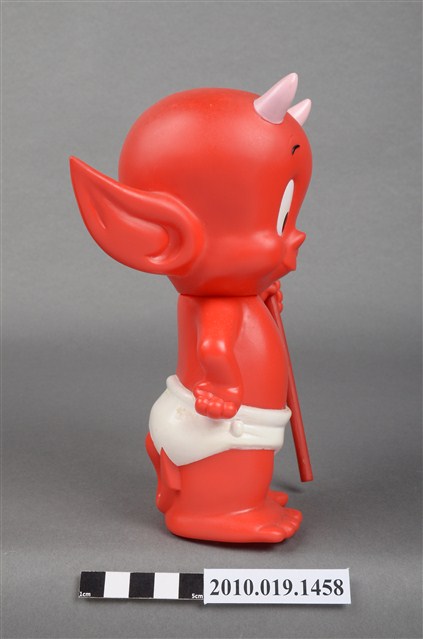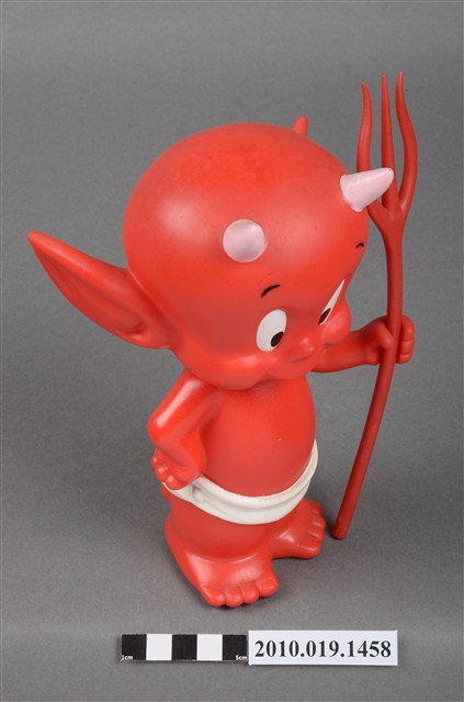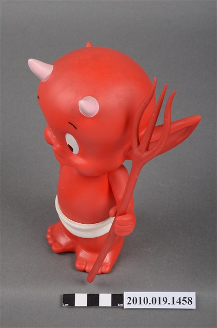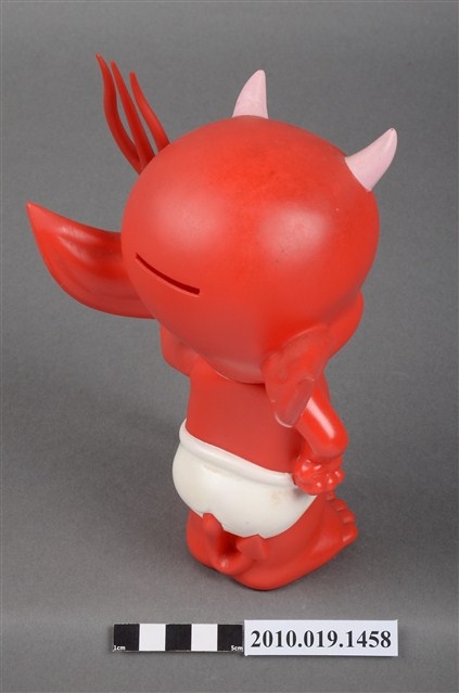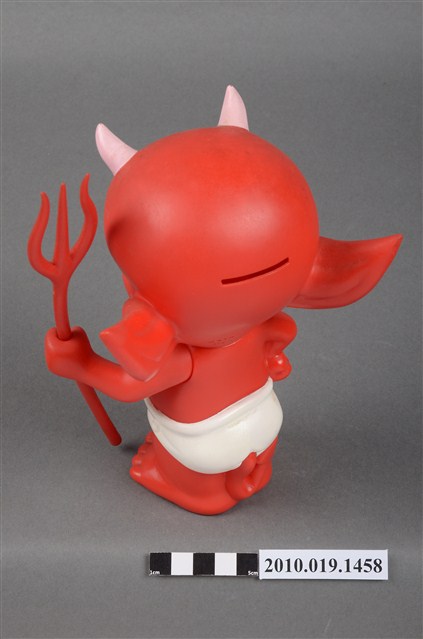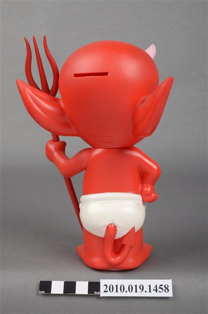 1.本物件為小惡魔存錢筒,材質為塑膠。小惡魔貌似小孩模樣整體為紅色呈現站姿,頭頂有兩支犄角臉帶微笑及一對尖耳朵,一手拿三叉戟,另一手插腰,穿著白色尿布屁股有條尾巴。頭部後上方有一長方形孔洞可投零錢,下方印有「© & T M Harvey」、「von Traumer」。底部中心有一透明圓形塞子,應為取出零錢處。