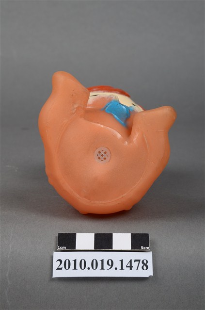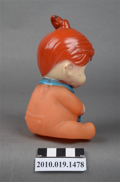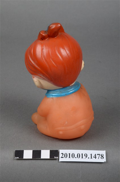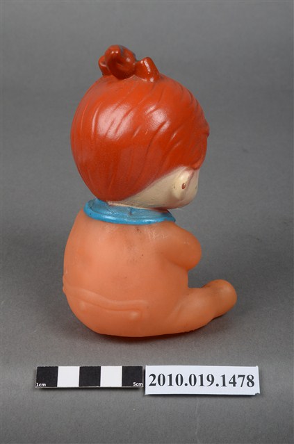 本物件為女嬰玩偶,塑膠材質,呈坐姿。玩偶臉部有著長睫毛,眼睛有白、黑與藍色顏料塗裝。玩偶身穿橘色連身嬰兒服,手持藍色奶瓶。玩偶底部有一圓形網狀孔洞,本物件表面上有許多髒汙。