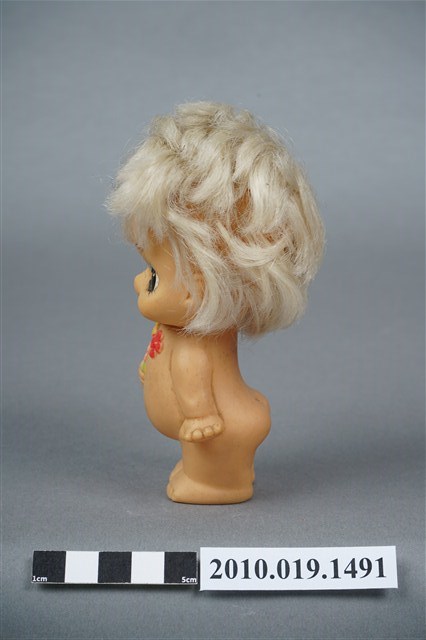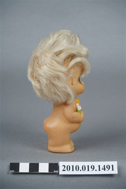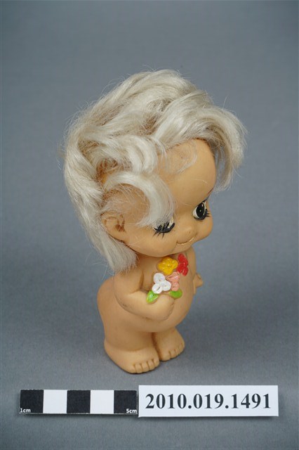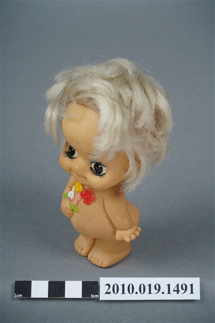 本物件為女孩玩偶,塑膠材質,呈站姿。玩偶臉部有著長睫毛,眼睛有白、黑與藍色顏料塗裝,右手持1束粉紅、紅、黃與白色花朵。本物件表面上有許多髒汙。