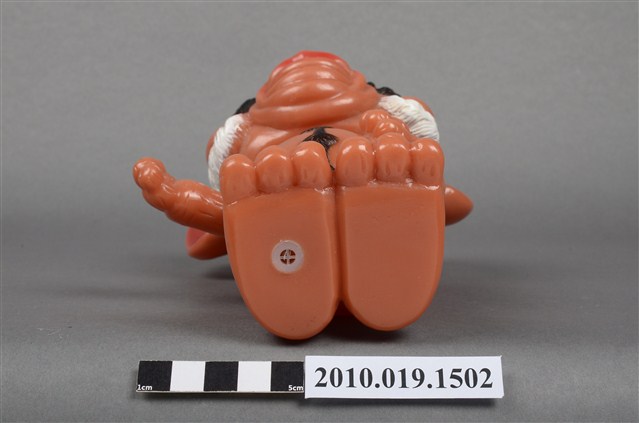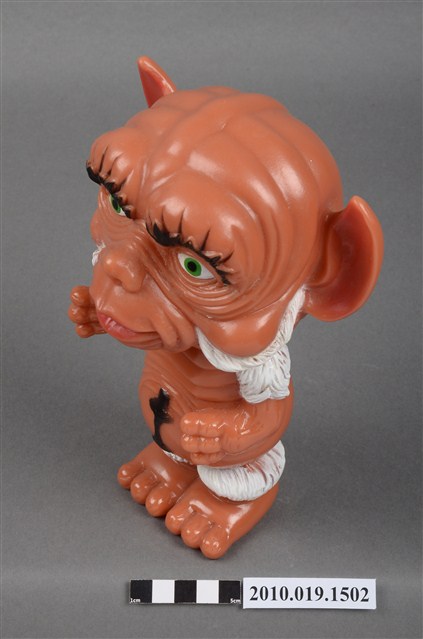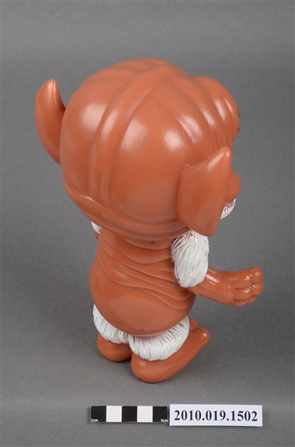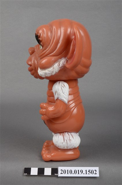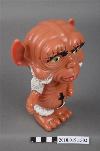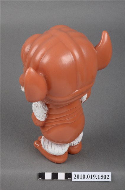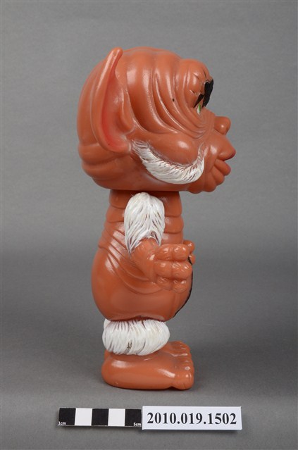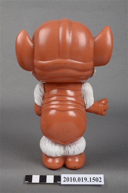 本物件為塑膠外星人玩偶,玩偶為咖啡色,頭大而無髮,濃眉大眼以及大尖耳,厚唇微張,雙頰、雙肩及腹部以下有白毛,臉上及身上有許多皺紋,肚臍處還有黑色線條,雙手各3隻手指頭,玩偶以站姿呈現,赤腳未著鞋。