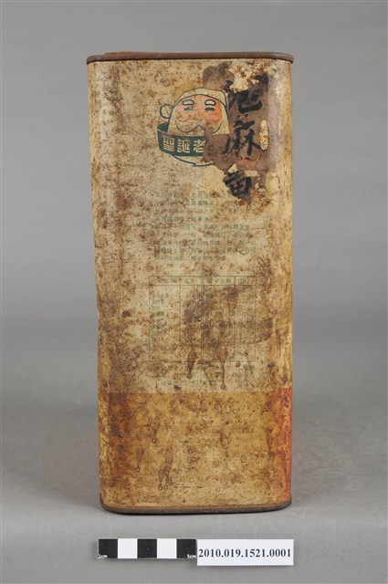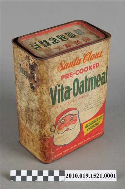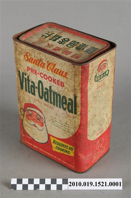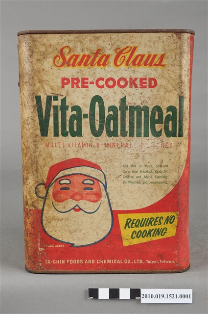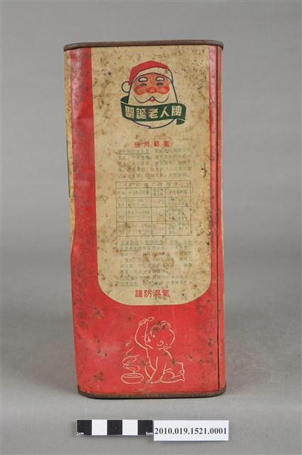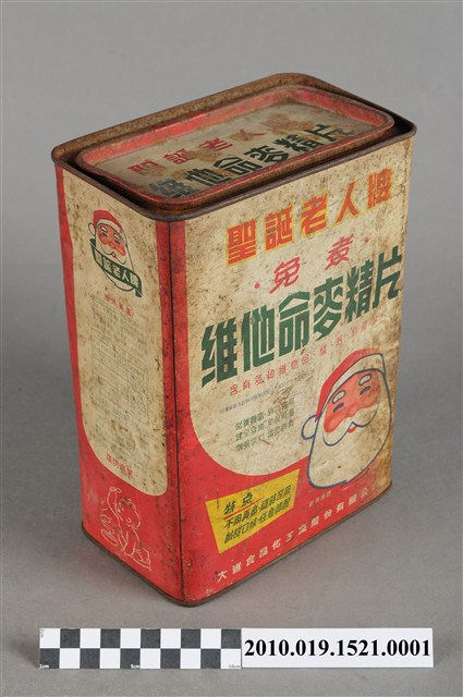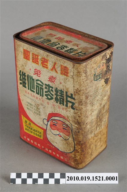 1.本物件為聖誕老人牌麥精片鐵盒,主要為鐵製方盒,上面為紅白底,最上方寫有「聖誕老人牌 免煮 維他命麥精片」,正中央有寫有「臺灣省衛生試驗所化驗合格45衛試 化字第1260號」,盒子右下角化有一個聖誕老公公臉形造型註冊商標,最下方並寫有「大進食品化工廠股份有限公司」字樣,測面寫有應用範圍與食用方法,背面則為英文版。