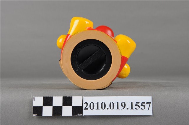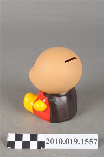 1.本物件為麵包超人玩偶存錢筒,材質為塑膠,頭為圓形,有紅色眼睛、鼻子及腮紅,身穿紅色套裝,手戴黃色手套及鞋子,胸前有一笑臉標誌。頭頂有一投幣孔,可將硬幣投入存錢筒,底部有開一圓形孔洞,可將硬幣從孔洞拿出,並塞有黑色塑膠塞。