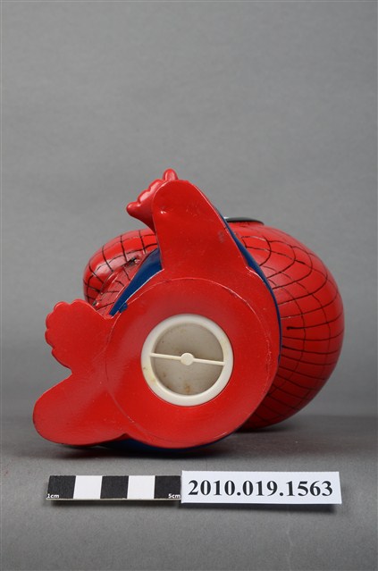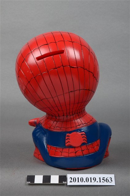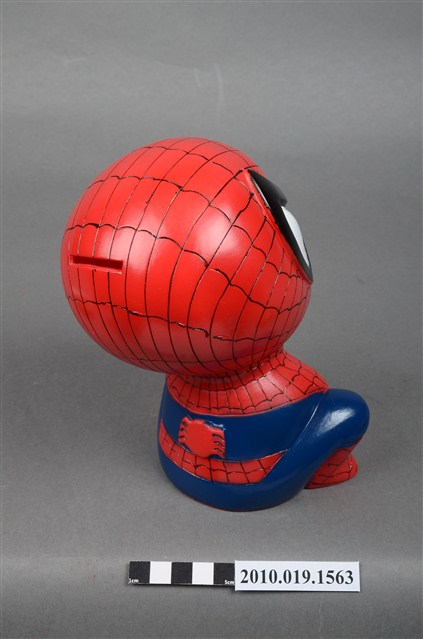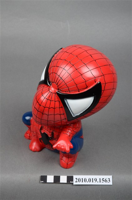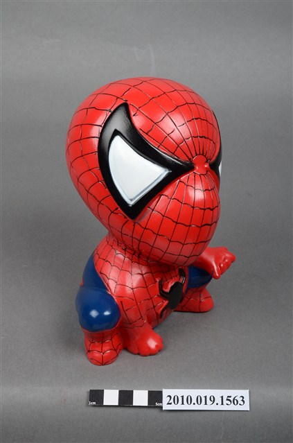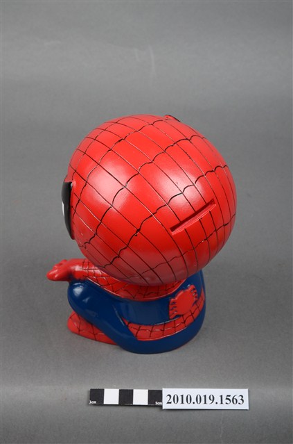 1.本物件為蜘蛛人玩偶存錢筒,材質為塑膠,外型為蜘蛛人身穿套裝時的模樣,姿勢呈現蹲姿,頭頂有一投幣孔,可將硬幣投入存錢筒,底部有開一圓形孔洞,可將硬幣從孔洞拿出,並塞有白色塑膠塞。