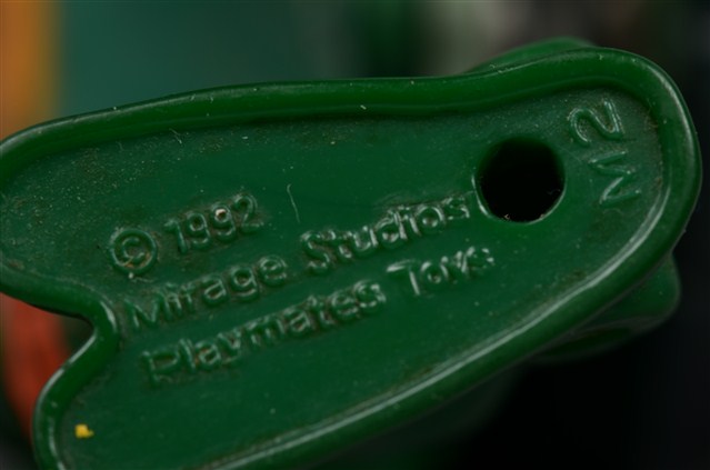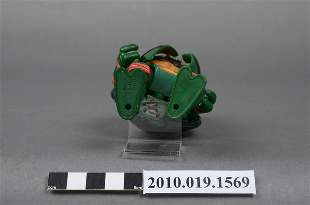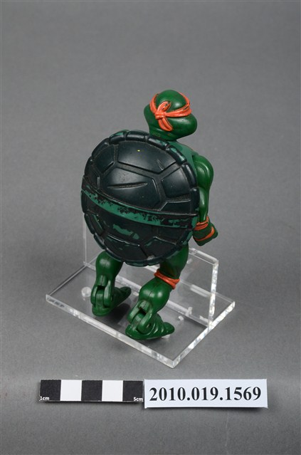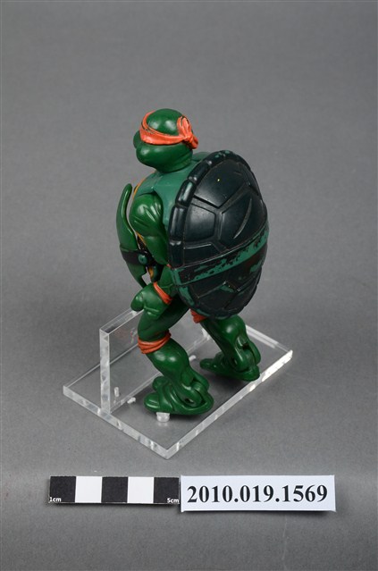 1.本物件為綠色忍者龜米開朗基羅玩偶,全身為綠色烏龜設計一體成型,張眼咧嘴,頭繫紅色頭巾,四肢也有紅色綁帶,肚子部分為咖啡色,在腰上繫有黑色皮帶並寫有黃色「M」,背後則背著黑色龜殼,玩偶以站姿呈現,手腳肌肉立體明顯。