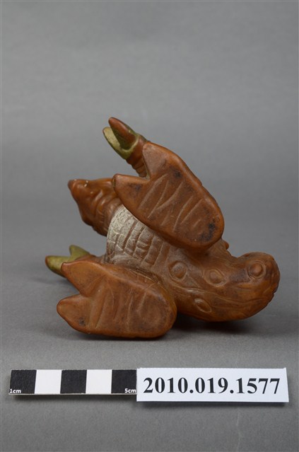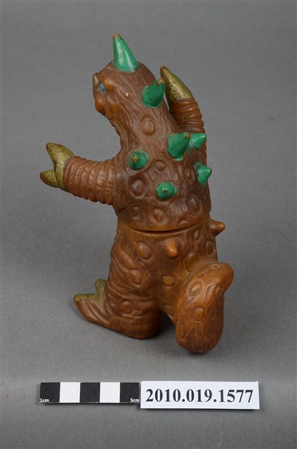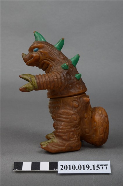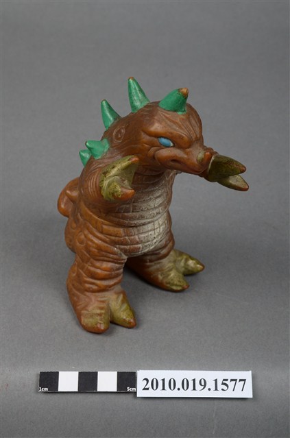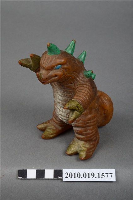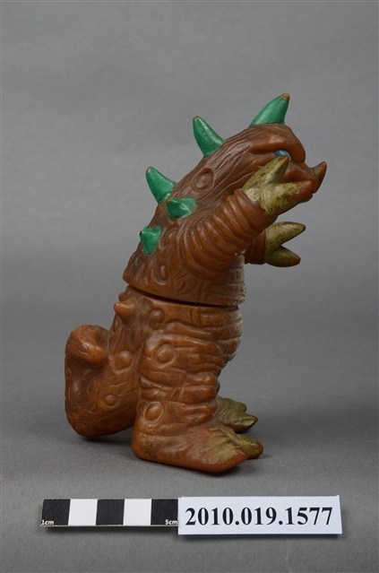 本物件為塑膠恐龍玩具,一體成型,主要為咖啡色系,藍色眼睛,背翼為綠色,雙手與雙腳的爪子為金色,尾巴微卷向上,中間處有一條明顯隙縫,顯示玩具可以上下拆起,整個物件有些粗糙與褪色。