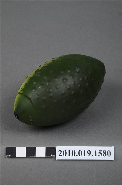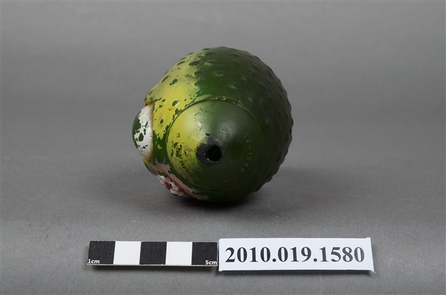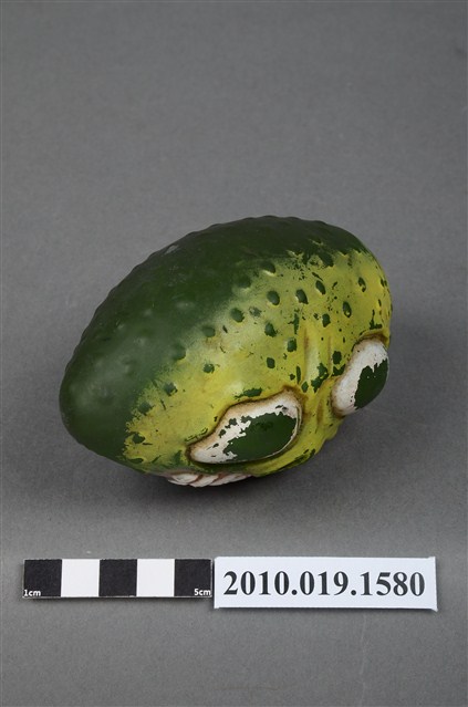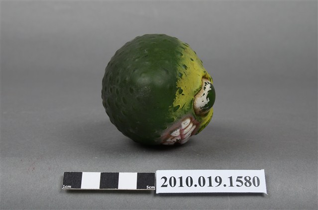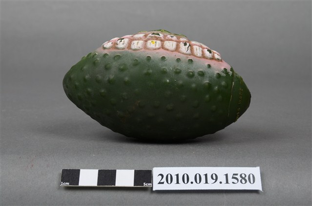 本物件為骷顱玩具球,為塑膠材質橄欖球樣式,主要為綠色,球的正面有兩顆綠色大眼睛,綠色大鼻孔,並張大嘴露出上下排整齊的白色牙齒,整體造形看起來像骷顱造型,整個物件有些斑駁痕跡。