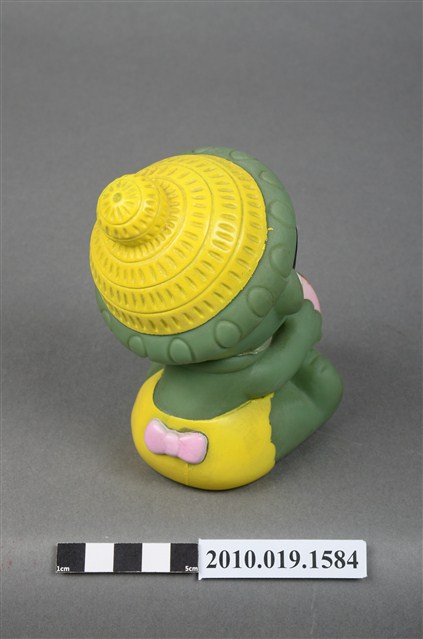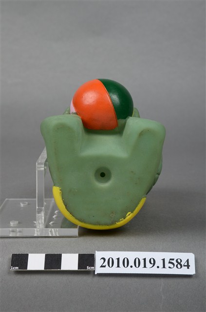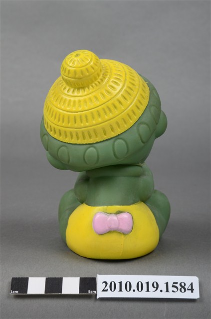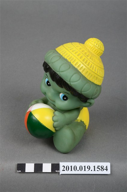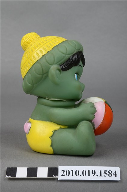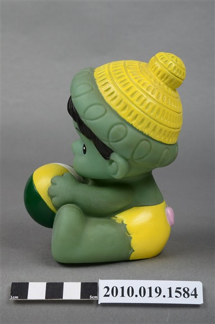 本物件為綠色玩球男孩玩偶,塑膠材質一體成型,玩偶全身為綠色,頭戴綠色圓帽頂端有黃色圖案點綴,露出淺黑色瀏海,細眉大眼,嘴唇微張,雙頰圓潤,雙手持一顆紅綠黃白相間的皮球,腳上未著鞋,以坐姿呈現,整個物件保存良好。