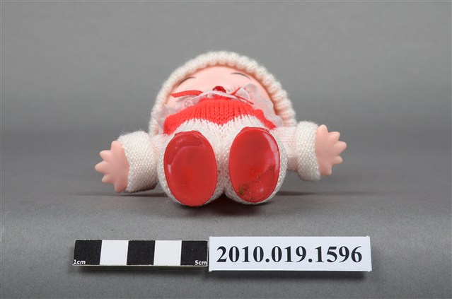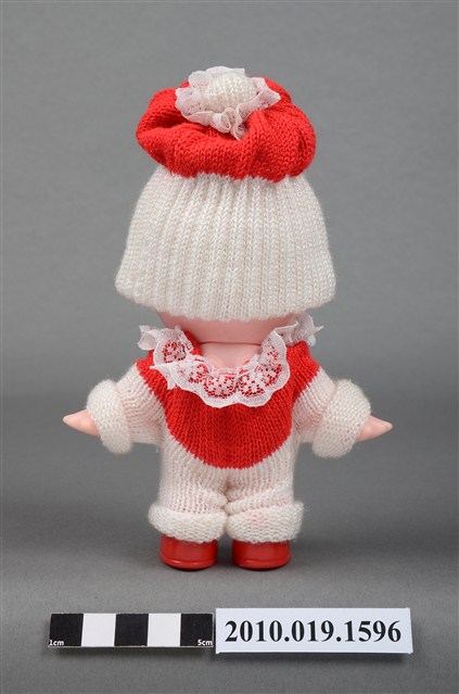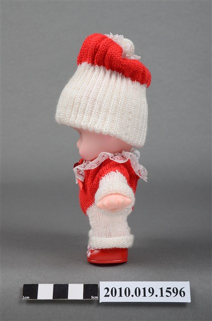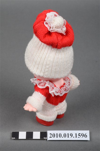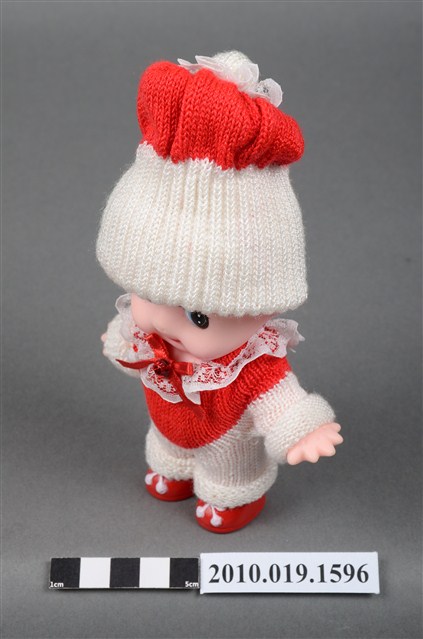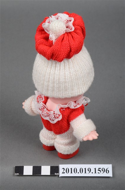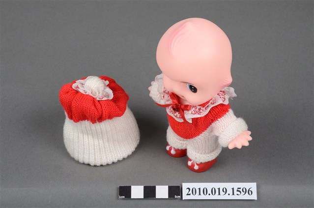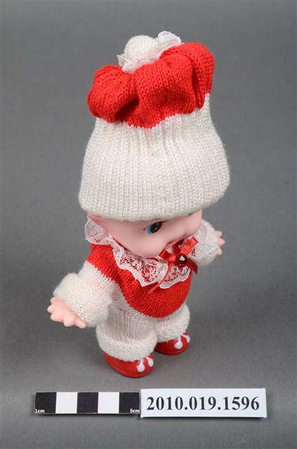 1.本物件為紅白相間丘比玩偶,塑膠材質一體成型,玩偶頭戴白色毛帽,帽子頂端有紅色圖案點綴,大眼有明顯睫毛,紅唇微笑,兩頰有腮紅,身著紅白相間連身褲子,領口處有一條白色蕾絲圍兜,並且繫有一個紅色蝴蝶結,褲子向上捲起,雙手袖子亦捲起,腳著紅鞋,鞋上有白色蝴蝶結綁帶,雙手平舉以站姿呈現,整個物件保存良好,十分乾淨。