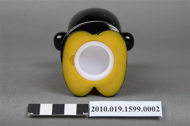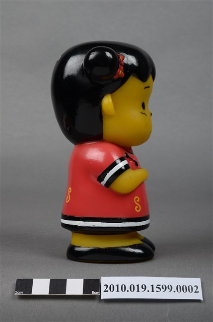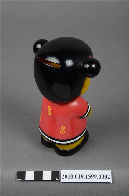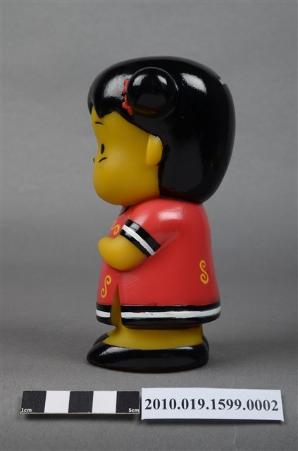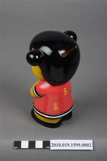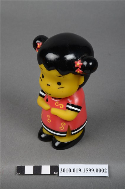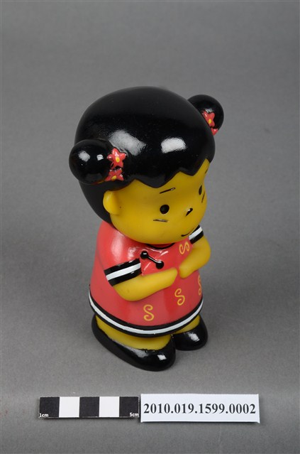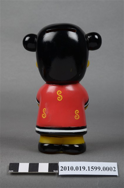 1.本物件為模範生點心餅女生吉祥物存錢筒,頭綁丫髻,身穿紅色滾黑邊,鈕釦為黑色、帶有黃色S形花紋的旗袍,腳穿黑色鞋子,做出拱手手勢。
