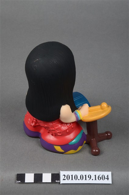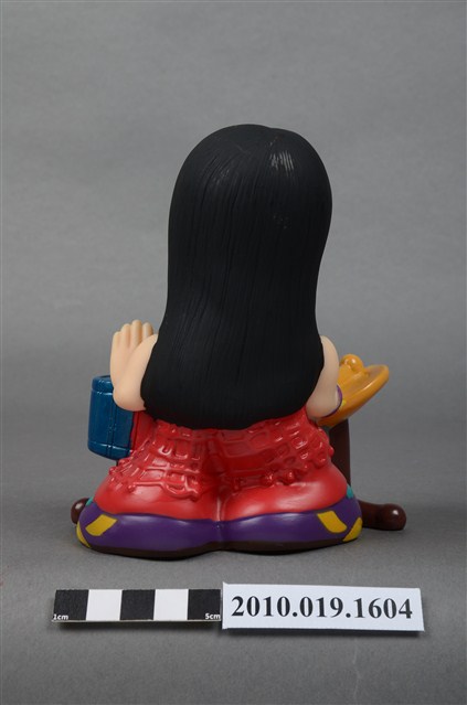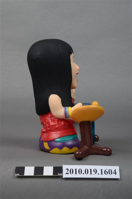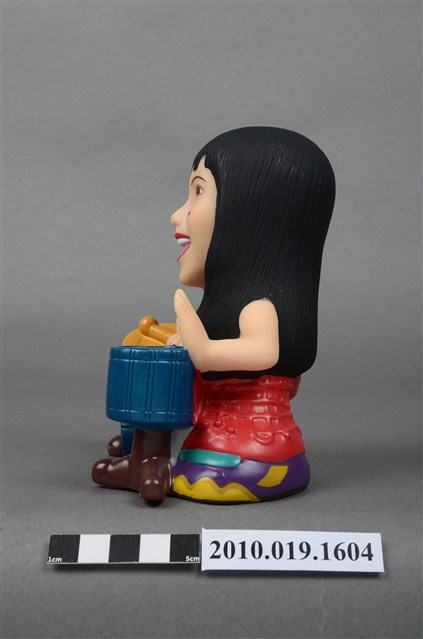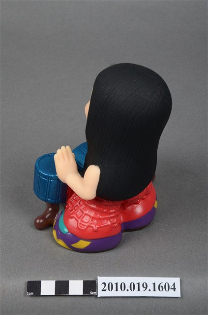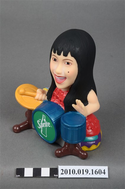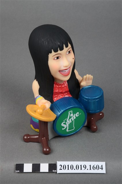 1.本物件為雪碧阿妹打鼓玩偶,為塑膠材質,玩偶長髮並有瀏海,細眉大眼,紅唇露齒微笑,兩頰有腮紅,右臉有一顆痔,眼睛看向左方,身穿紅色無袖上衣,紫色褲子,前方有一組鼓,以站姿方式呈現,鼓面畫有「Sprite及商標」,整個物件保良好,十分乾淨。
