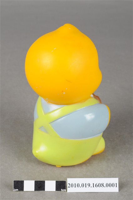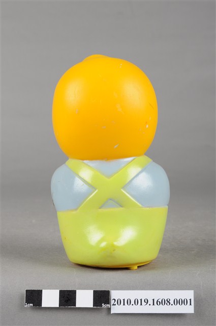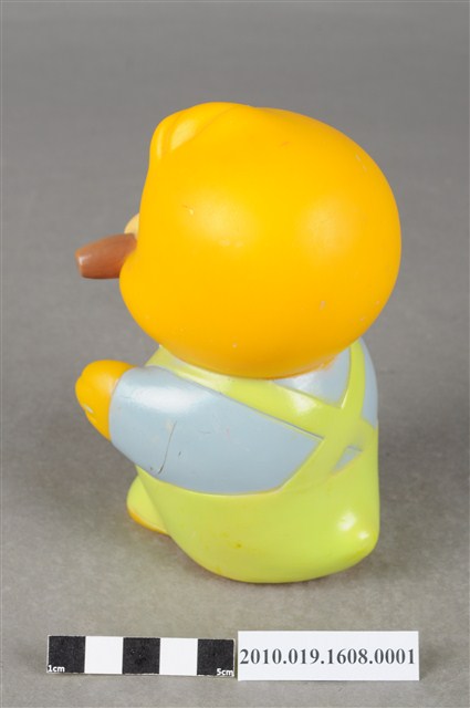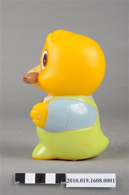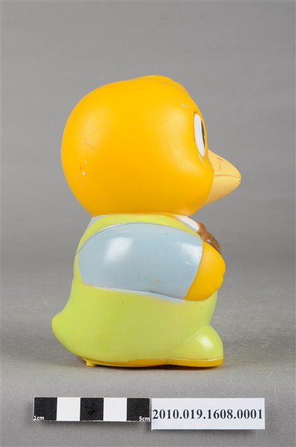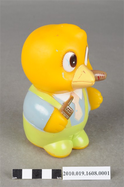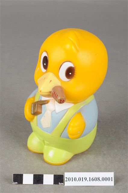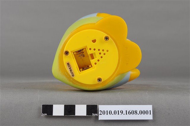 1.本物件為馬來西亞雀巢麥片爸爸鳥玩具,塑膠製品一體成型,玩偶身穿藍色上衣並有繫白領帶,下半身為綠色吊帶褲,大眼睛,嘴裡抽雪茄,右手持一支咖啡色無線電,底部有一個長方形裝置電池的盒子,但缺少蓋子,下方並寫有「MADE IN MALAYSIA」字樣,整個物件保存良好,唯有些許污漬。