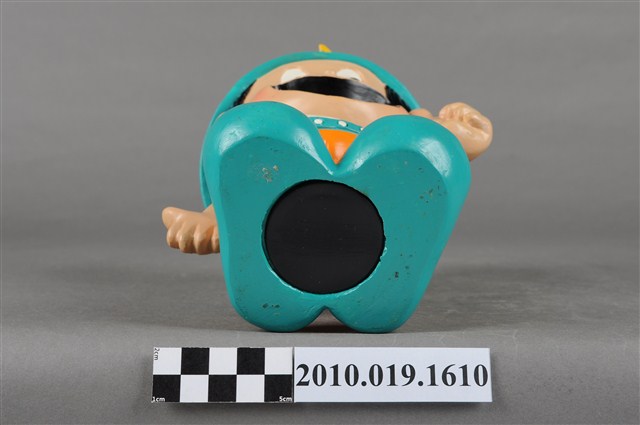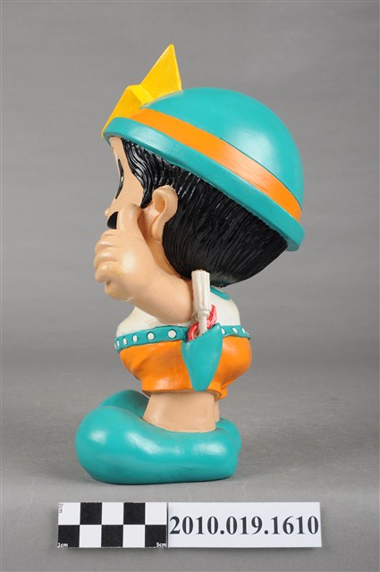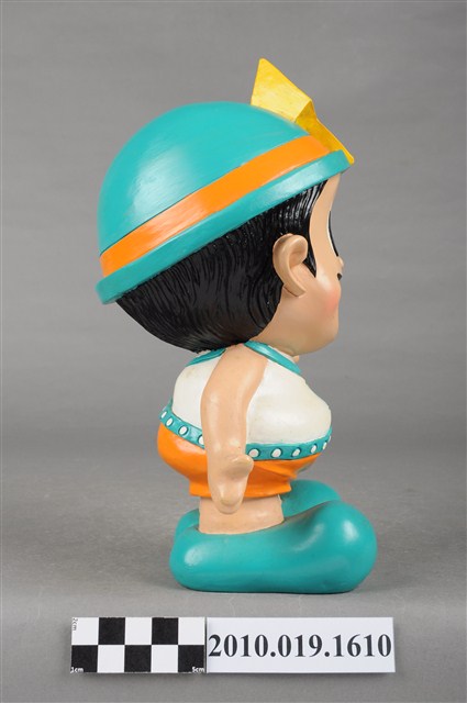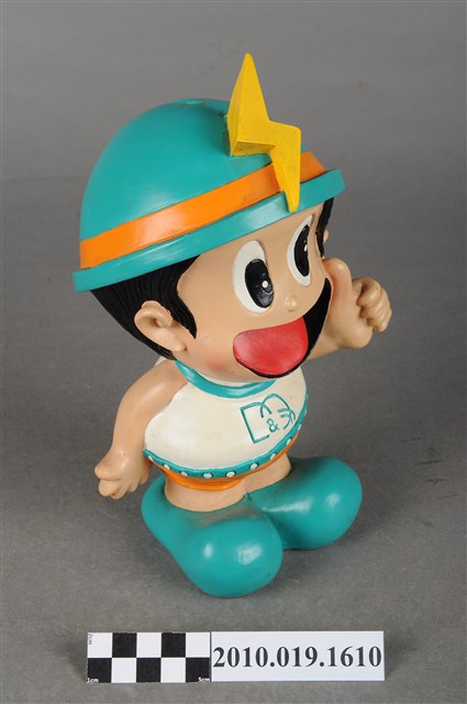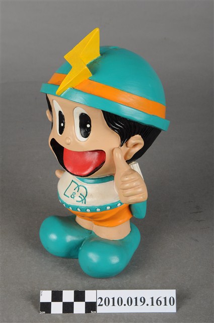 1.本物件為德久衛浴男孩造型存錢筒,頭戴淺藍色,滾橘邊,上有一閃電裝飾安全帽,身穿白色無袖T恤、橘色短褲,腰繫工具腰帶,掛著裝有螺絲起子、老虎鉗的工具袋,穿淺藍色鞋子,右手豎起大拇指。上衣正面有德久衛浴的商標。