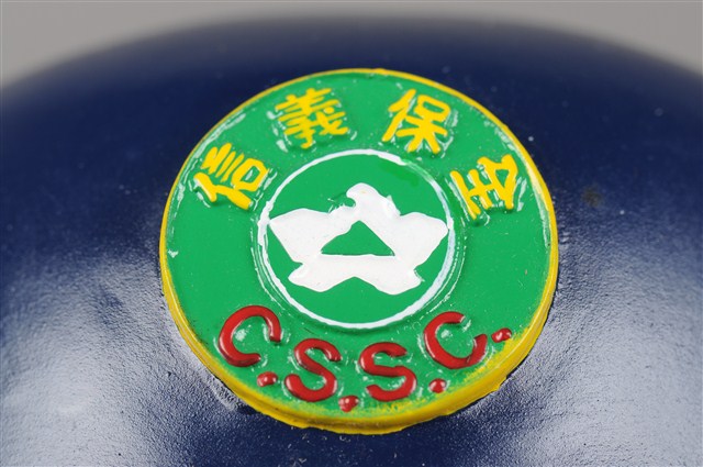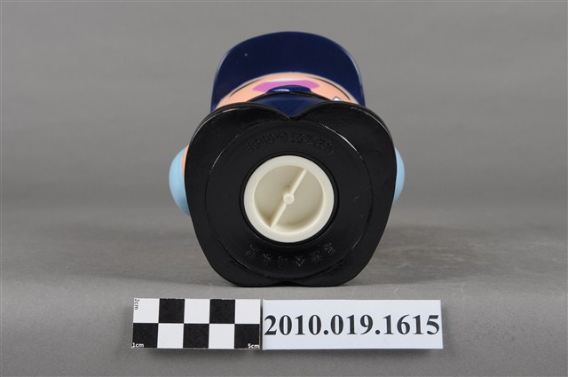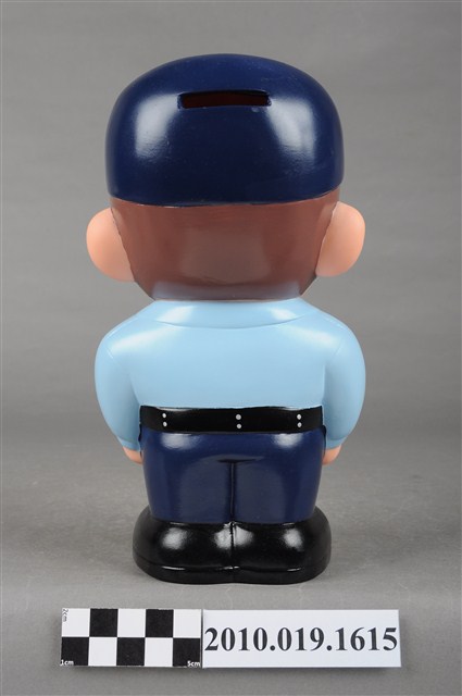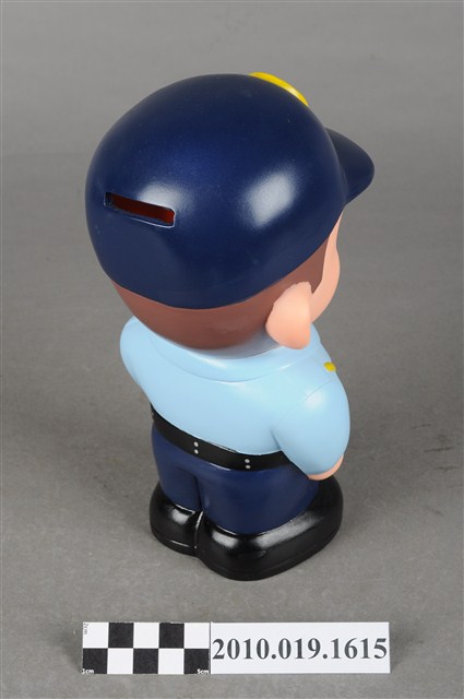 1.本物件為信義保全存錢筒,材質為塑膠。呈現立正站姿,臉部表情帶有兩道粗眉看似相當有精神,頭戴深藍色鴨舌帽上有信義保全logo,頭部後方有一長方形孔洞可投零錢,身穿保全服裝,淺藍色上衣打深藍色領帶,一邊胸前口袋有「信義保全」字樣及一個銀色哨子,另一邊肩膀有黃色肩帶,腰部配戴甩棍,下半身著深藍色長褲及黑色鞋子。底部中心有一白色圓形塞子,應為取出零錢處,旁有「嵩灃公司承製」、「(02)2570-0065」字樣。