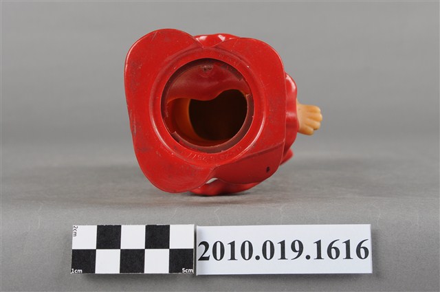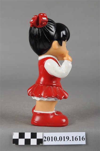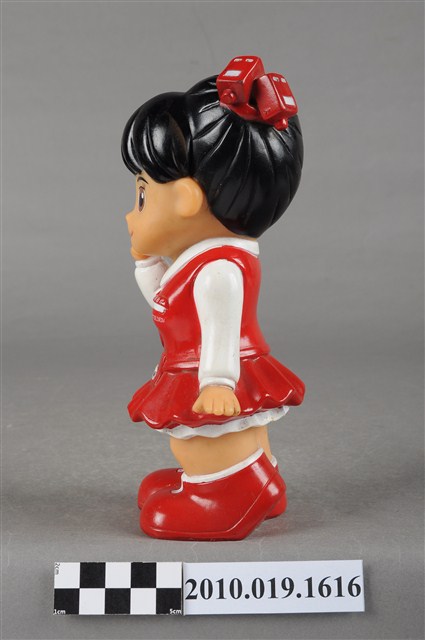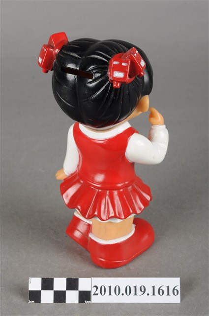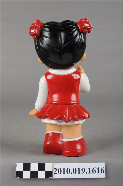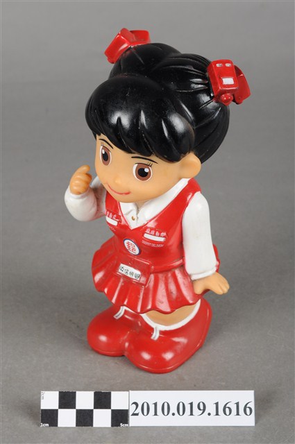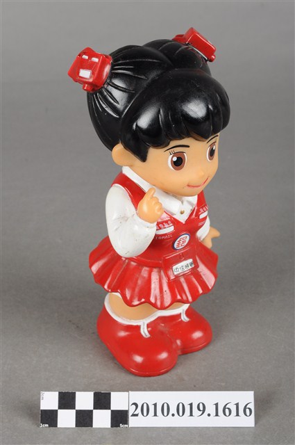 1.本物件為郵政女孩造型存錢筒,為塑膠製一體成型,玩偶頭上梳有兩顆包包頭,並繫上紅色帶子,細眉大眼並有睫毛,臉頰圓潤,紅唇微笑,身著白色襯衫外搭紅色背心波浪短裙,裙子右胸口寫有「航空郵件」字樣,左胸口寫有「限時郵件」字樣,正中間畫有郵局商標以及腰帶上寫有「收信時間」等字樣,腳上著紅鞋,玩偶背面頭上有細長方形開口,底盤也有一個圓形開口,可以將錢幣投入或取出。