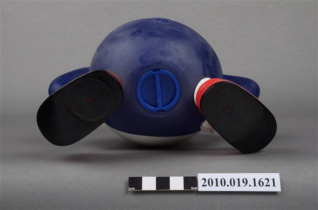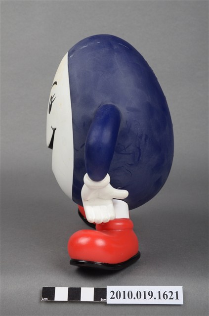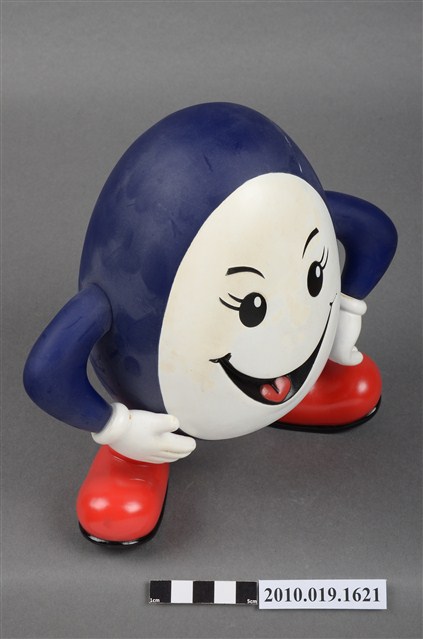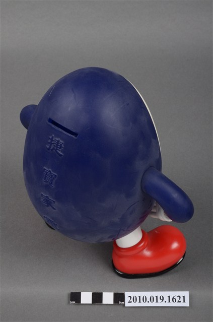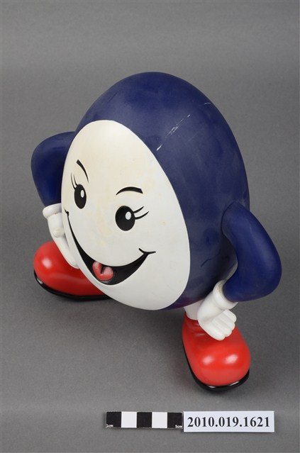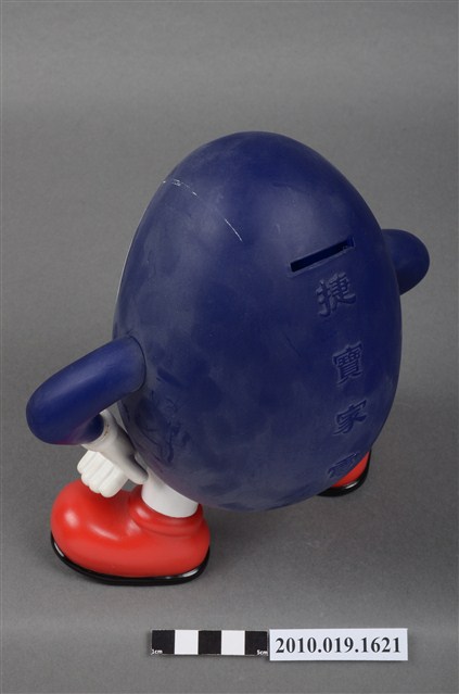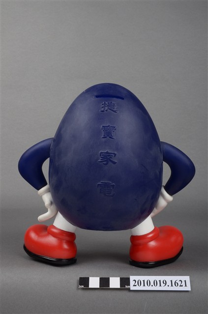 1.本物件為捷寶家電存錢筒,其外型為一顆橢圓形球狀,正面為白色,細眉大眼並有睫毛,張嘴大笑並露出紅色舌頭,雙手戴有白手套,左手插腰右手置於前面,腳穿紅色鞋子,玩偶背面為藍色,並在上方有細長方形開口,可以將錢幣投入,下方並寫有「捷寶家電」字樣,底盤有圓形開口,可以旋轉將錢取出,整個物件保存良好。