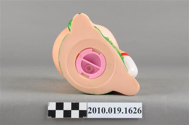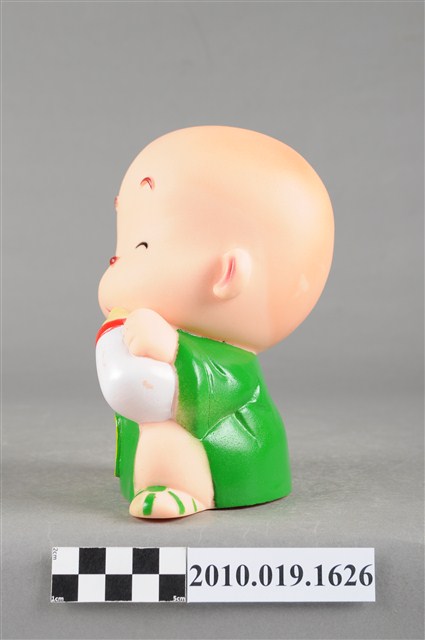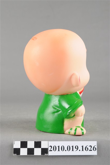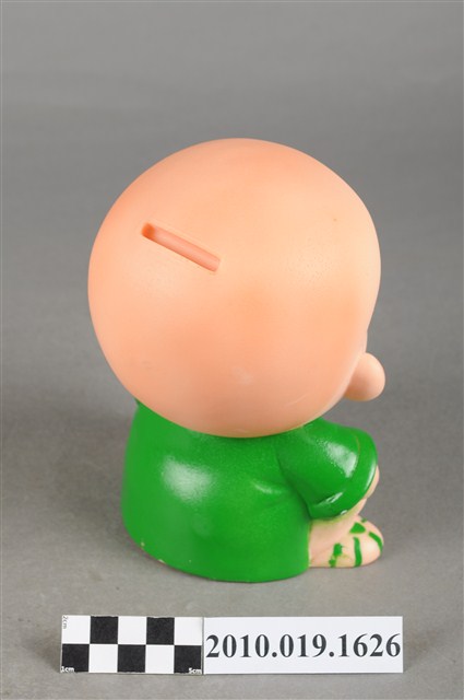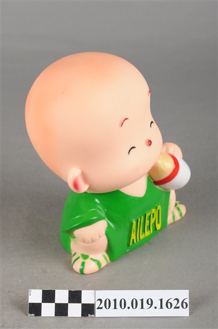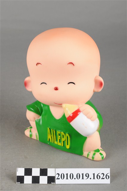 1.本物件為艾昱好寶寶存錢筒,為塑膠材質一體成型,外觀為一個嬰兒造型,玩偶頭上無髮,細眉閉眼並有紅色鼻子,紅唇微笑,身著綠色V領衣服,衣服上有黃色「AILEPO」字樣,左手持一個白色奶瓶,瓶蓋為紅色,腳著黃粉相間鞋子,以坐姿呈現,並在頭部上方有細長方形開口,可以將錢幣投入,底盤有粉紅色蓋的圓形開口,可以旋轉將錢取出,整個物件保存良好。