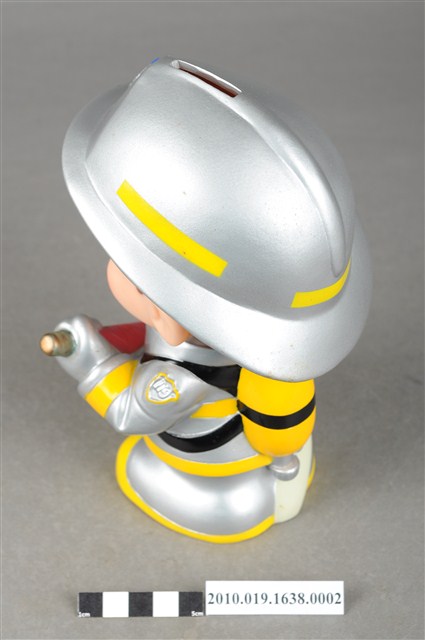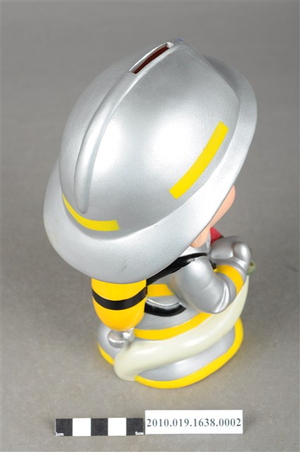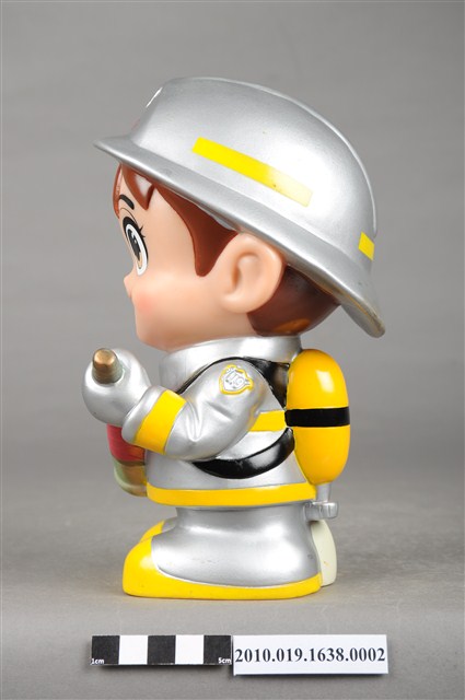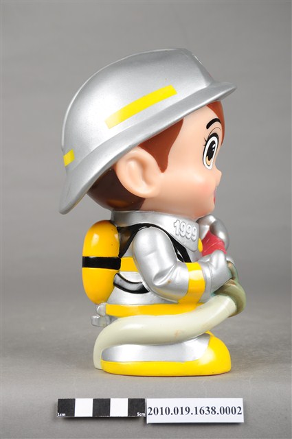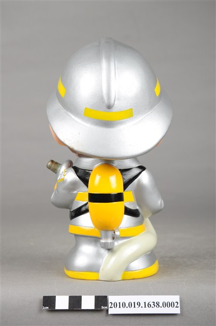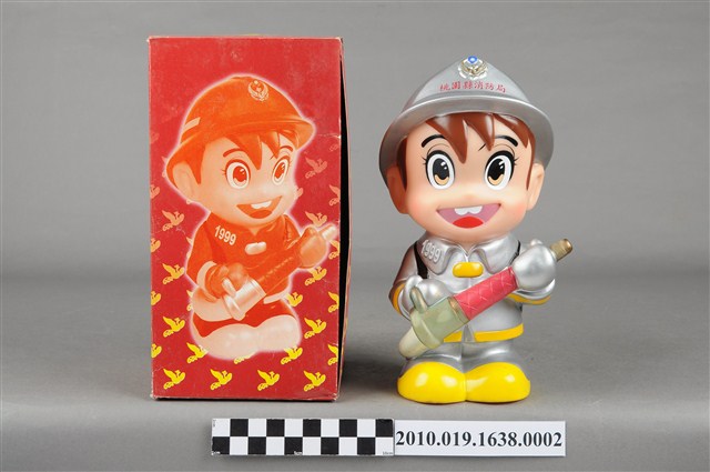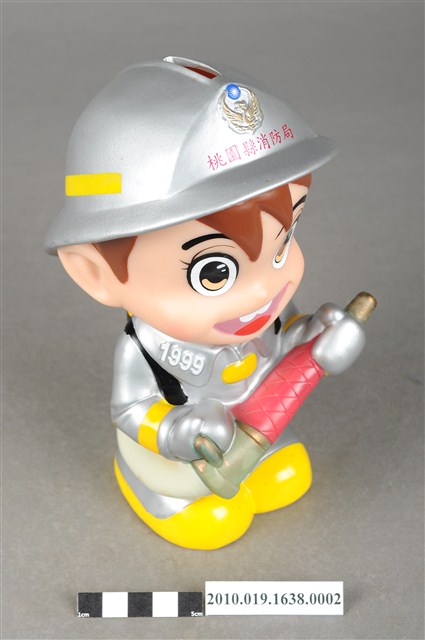1.本物件為桃園縣消防寶寶造型存錢筒,身穿銀色頭盔、消防衣與靴子的全套消防設備,手拿消防瞄。頭盔上有「桃園縣消防局」字樣與消防標誌,右側衣領上有「1999」字樣的消防寶寶存錢筒。