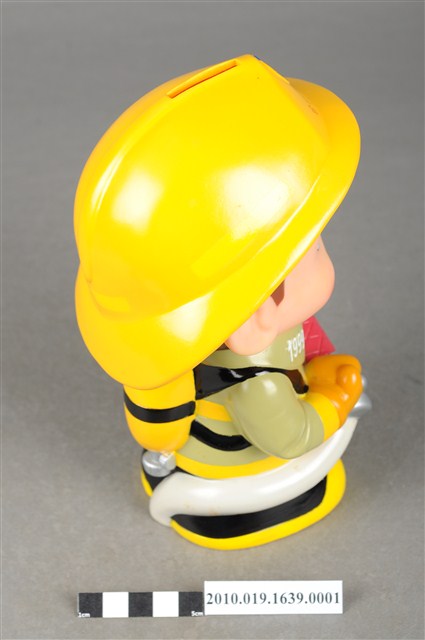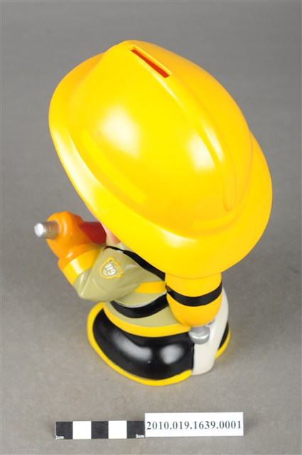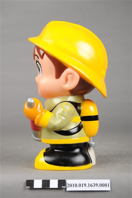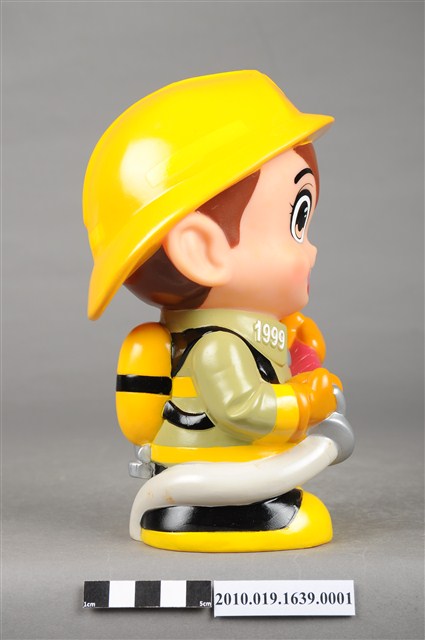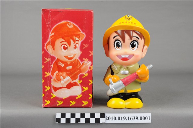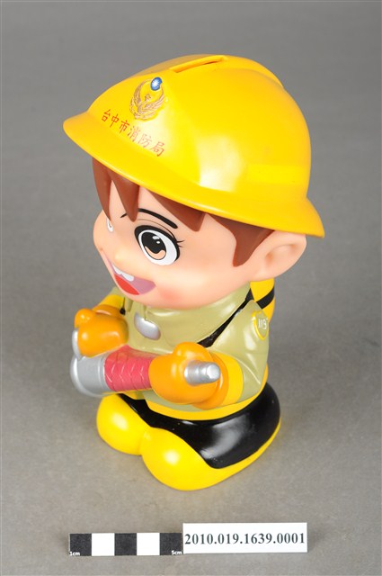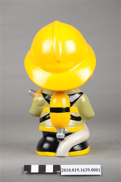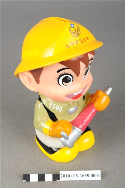 1.本物件為臺中市消防寶寶造型存錢筒,身穿黃色頭盔、綠色消防衣、黑色靴子的全套消防設備,手拿消防瞄,頭盔上有「台中市消防局」字樣與消防標誌,右側衣領上有「1999」字樣的消防寶寶存錢筒。