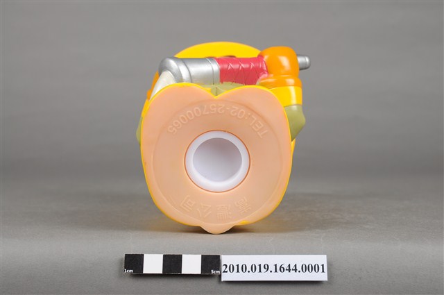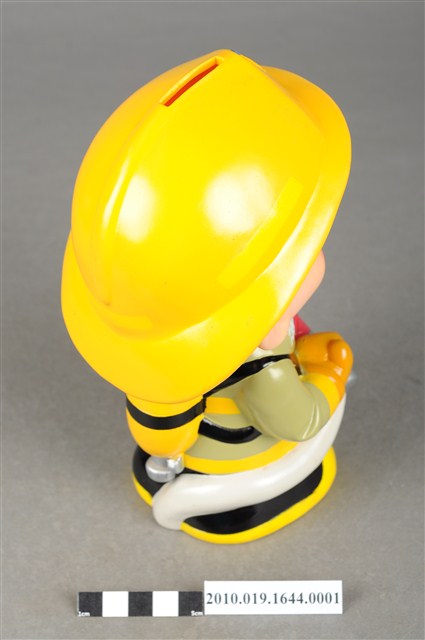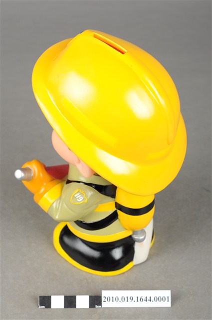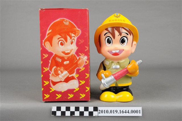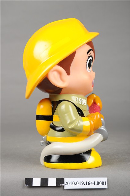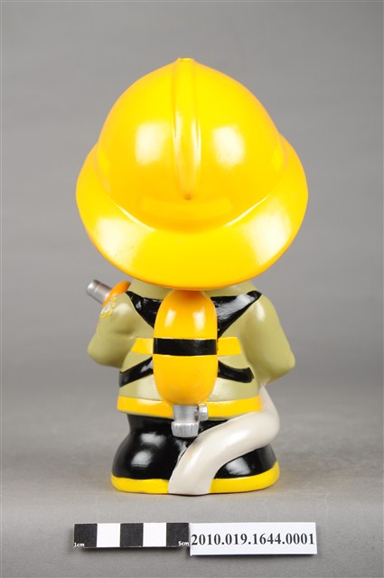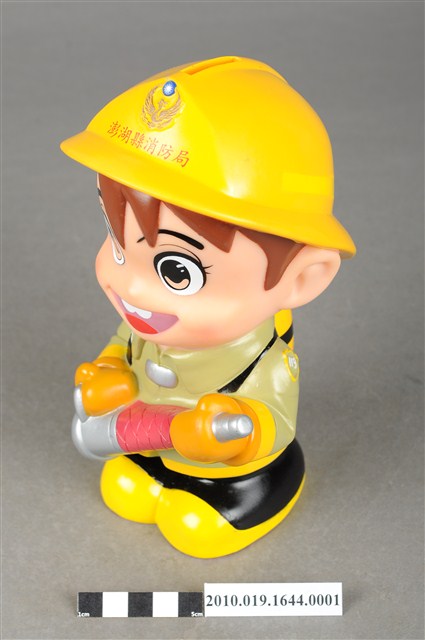 1.本物件為澎湖縣消防寶寶造型存錢筒,身穿黃色頭盔、綠色消防衣、黑色靴子的全套消防設備,手拿消防瞄,頭盔上有「澎湖縣消防局」字樣與消防標誌,右側衣領上有「1999」字樣的消防寶寶存錢筒。